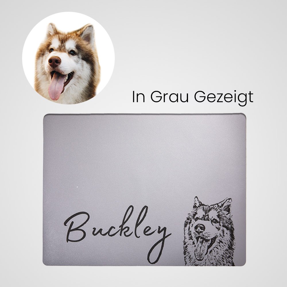 Laden Sie das Foto Ihres Haustieres hoch. Geben Sie seinen eigenen Namen ein, damit Ihr kluger pelziger Freund genau wissen, wem dieses einzigartige Platzdeckchen gehört.