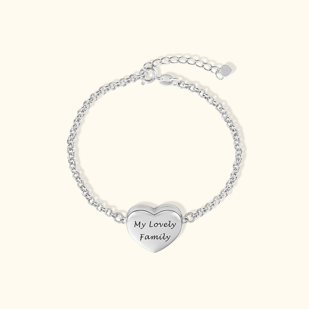 Dieses Armband ist exquisit und schön, mit einer herzförmigen Taschenuhr als Hauptdesign, die ewigen Schutz symbolisiert. Sie können Ihre Fotos im Inneren des herzförmigen Anhängers anpassen, um Ihre schönen Momente einzufrieren, und Ihre Erinnerungen werden für immer geschützt werden. Fügen Sie eine aufrichtige Nachricht auf der Oberfläche des Anhängers hinzu, um das Armband zu einem wirklich sentimentalen Schmuckstück zu machen.