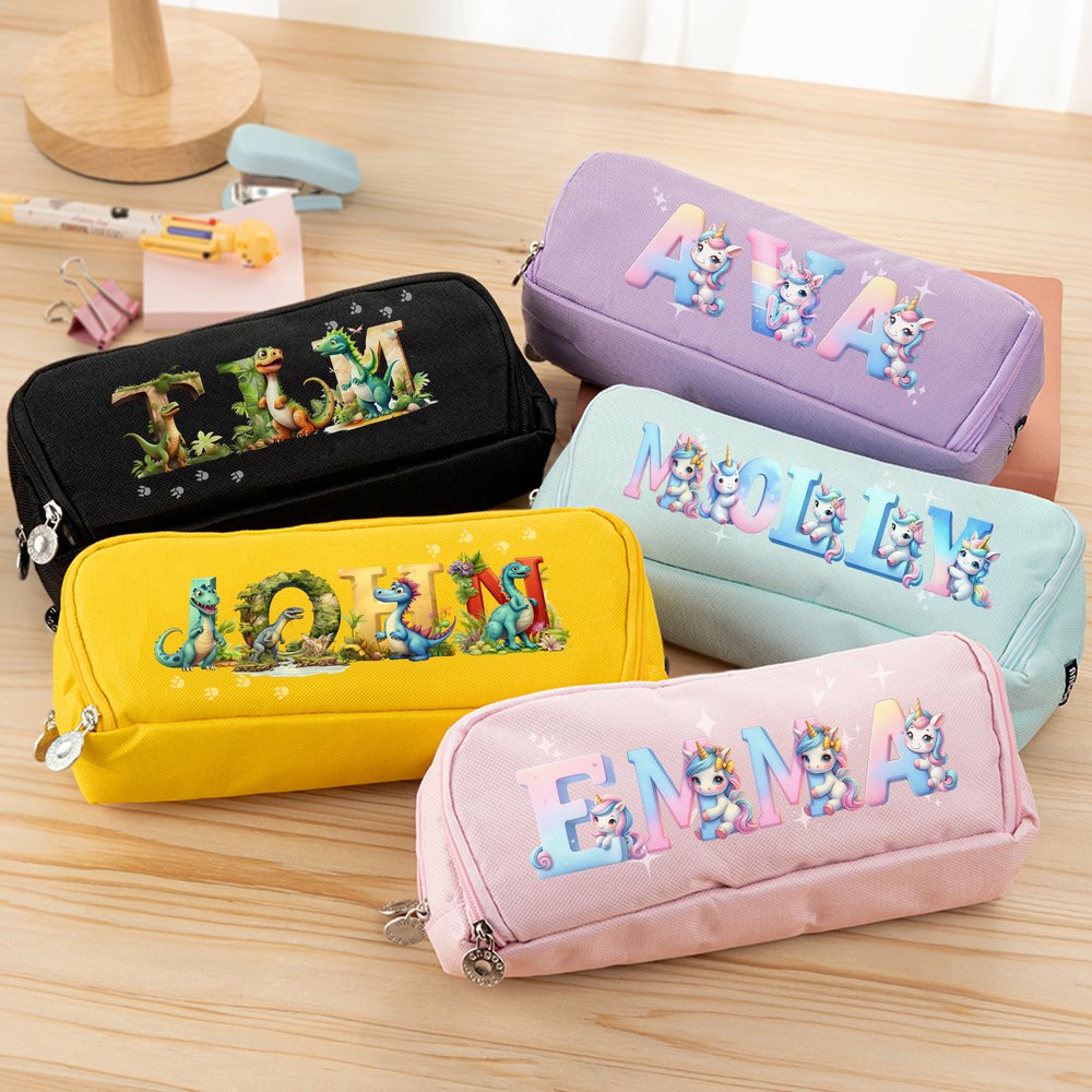 Unser Federmäppchen besticht durch ein fröhliches Dinosaurier- und Einhorn-Motiv, kombiniert mit lebendigen Hintergrundfarben und verspielten Schriftmustern. Es ist die ideale Wahl für Schüler und Studenten jeden Alters. Sie können es zudem mit Ihrem Namen personalisieren und so zu einem einzigartigen modischen Accessoire machen.
