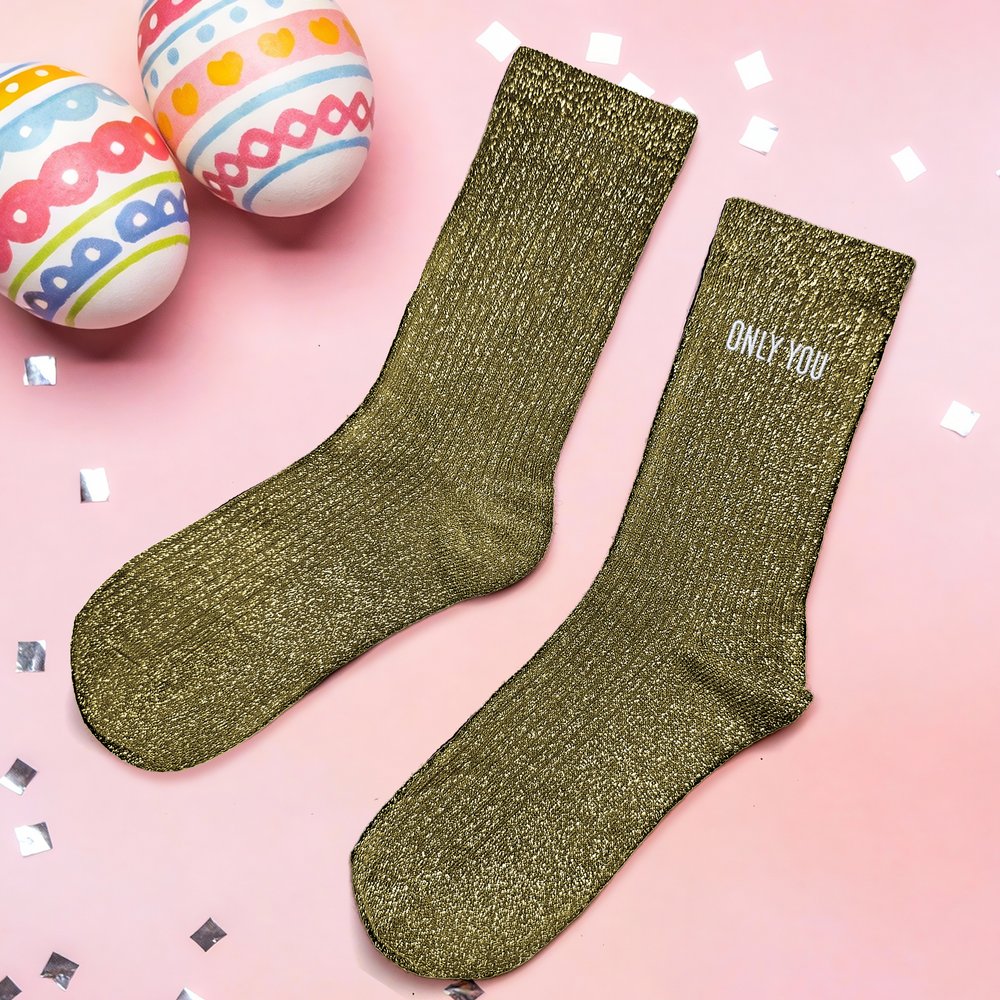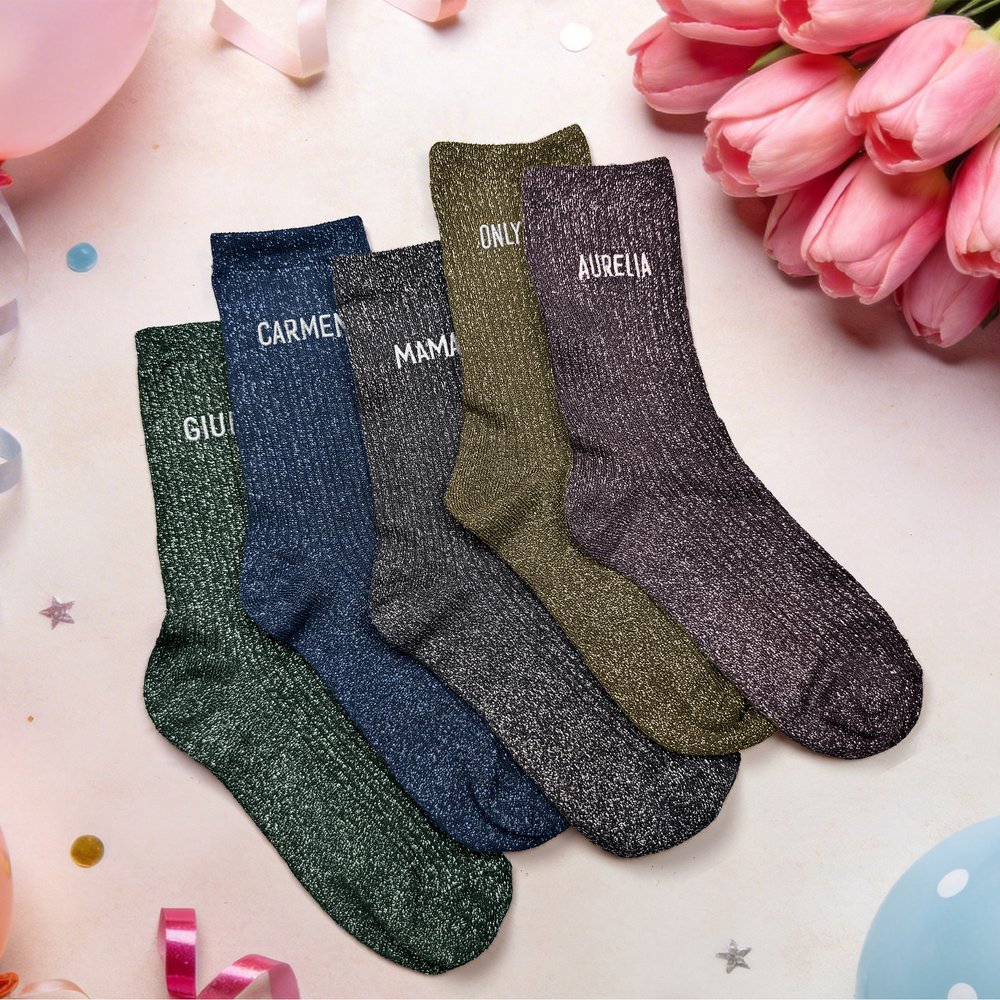Die Socken haben einen dezenten Glitzereffekt und eine Namensstickerei. Jedes Paar ist ein Unikat, das deinen persönlichen Stil unterstreicht. Erhältlich in 5 dunklen Metallic-Farben, alle in tiefen, stimmungsvollen Tönen mit einem ausgeprägten Metallic-Finish. Die feinen, schimmernden Pailletten sorgen für einen eleganten Metallic-Glanz, der bei jedem Schritt das Licht einfängt und ein Gefühl von Bewegung und Dynamik vermittelt.