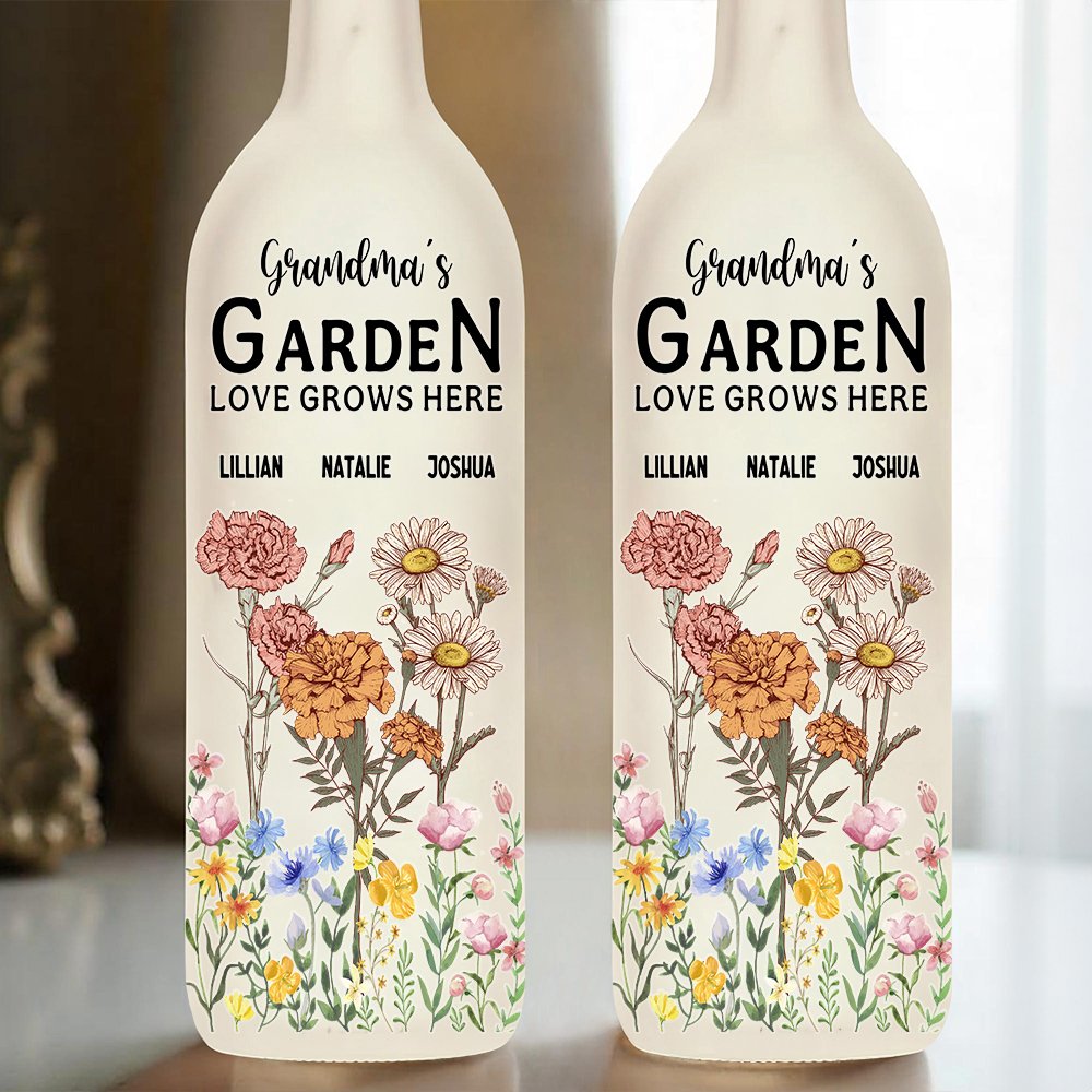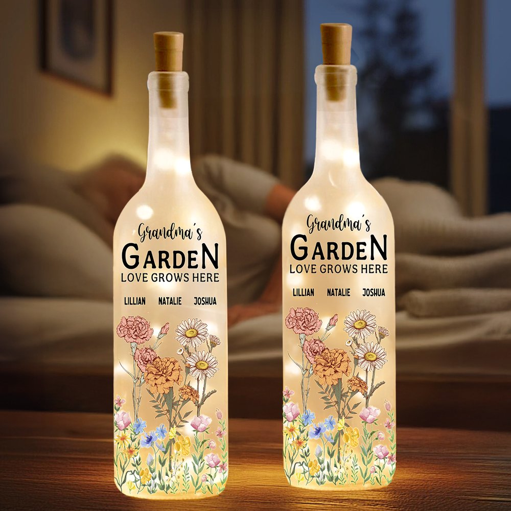 Diese Flaschenlampe zeigt personalisierte 1-18 Geburtsblumen und Namen