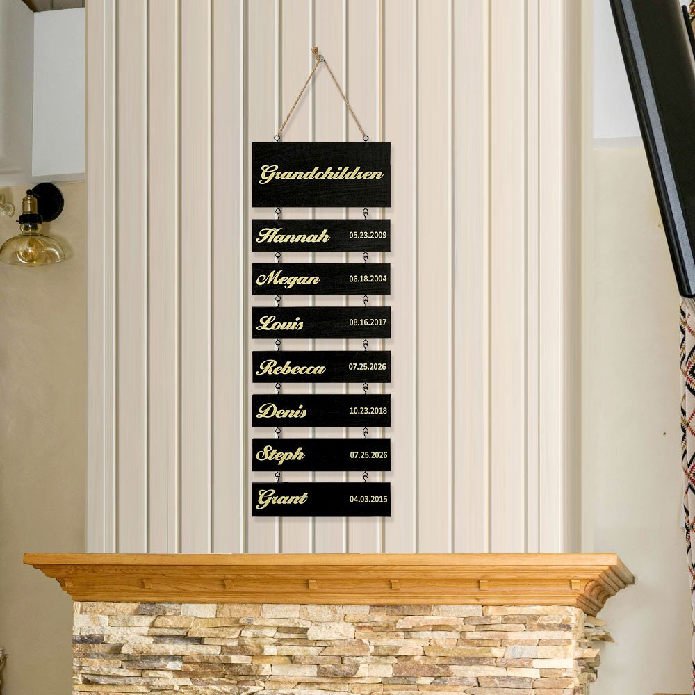 Auf diesem bezaubernden Holzschild können Sie die Namen von bis zu 18 Enkelkindern zusammen mit ihren Geburtsdaten individuell gestalten und es so in eine herzliche Zeitleiste Ihrer wachsenden Familie verwandeln. Jeder Name und jedes Datum sind eine süße Erinnerung an die Freude, die jedes Enkelkind mit sich bringt, und machen das Schild zu einem bedeutungsvollen Mittelpunkt für das Zuhause der Großeltern.