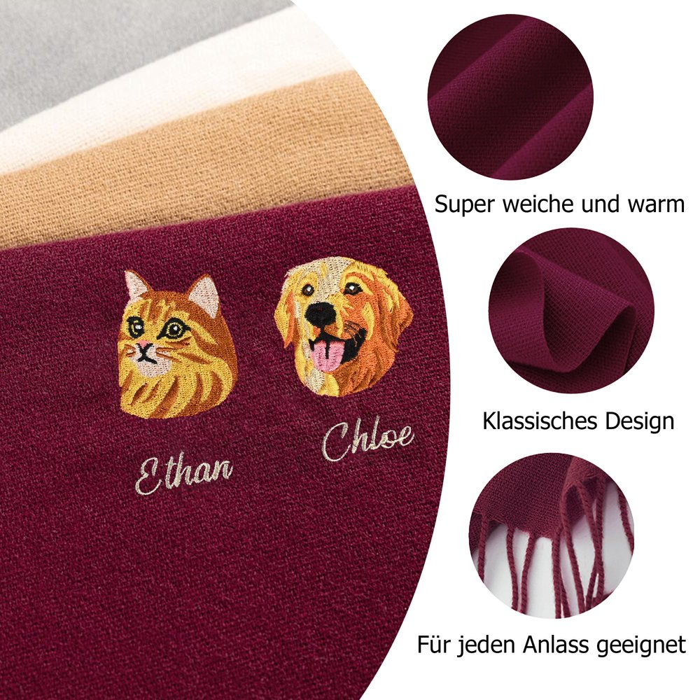 Dieser Schal verwandelt Ihre geliebten Haustiere in warme Begleiter. Mithilfe sorgfältiger Sticktechniken werden die liebenswerten Gesichtsausdrücke von 1 bis 3 Haustieren detailgetreu dargestellt. Ob die gemütliche Schlafpose einer Katze oder das strahlende Lächeln eines Hundes – all das wird als kunstvolle Stickerei auf dem Schal lebendig. Individuell mit exklusivem Namen personalisiert, begleitet Sie dieser Schal mit Sehnsucht und Wärme durch den Alltag.