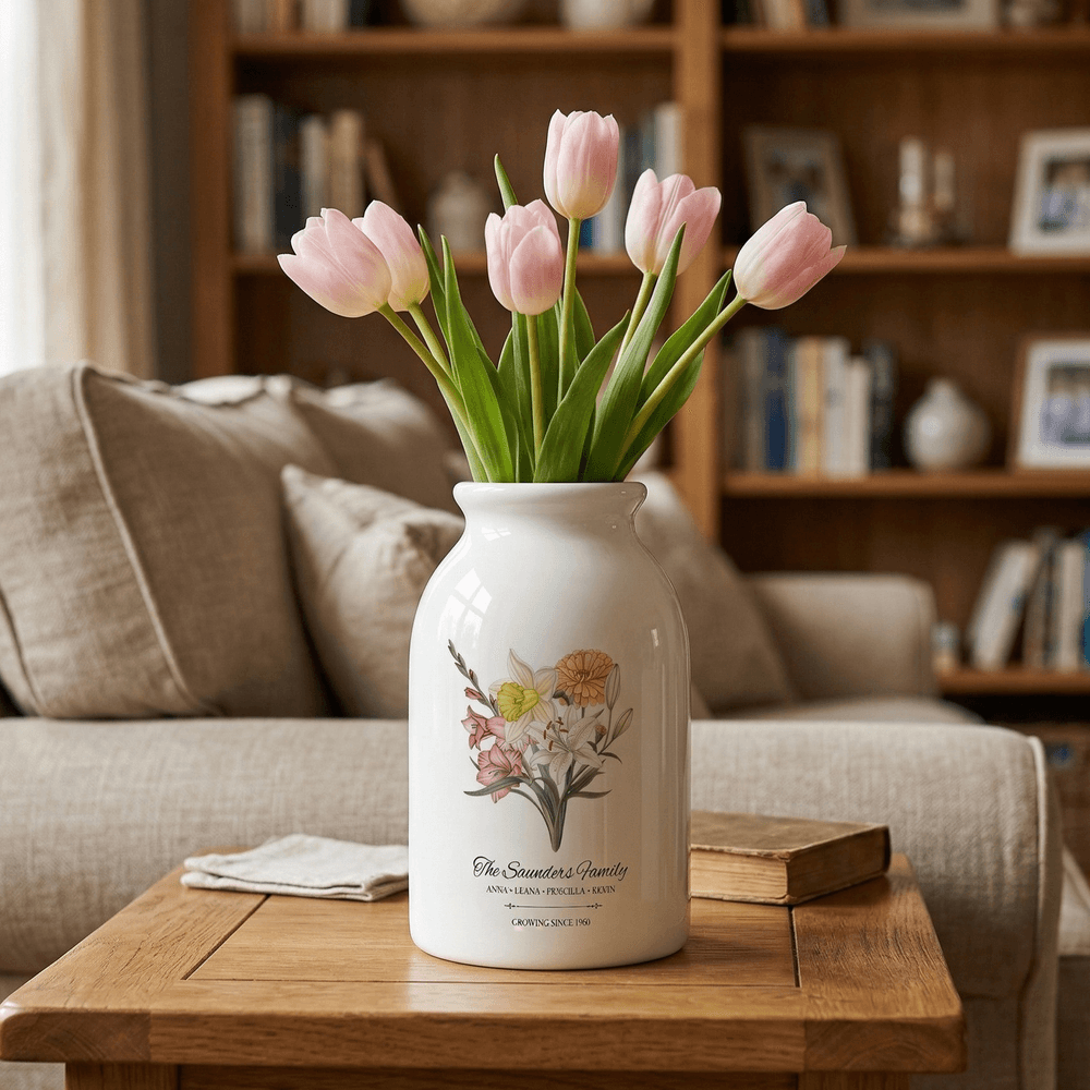 Dieses individuell gestaltete Blumenvasen-Set ist das ultimative Geschenk für Mütter, Großmütter, Ehefrauen oder jedes andere geliebte Familienmitglied, das von Herzen kommt. Es ist ein ideales Geschenk für Muttertag, Weihnachten, Geburtstage, Jubiläen oder Einweihungen. Es kombiniert zeitlose florale Schönheit mit Personalisierung, um ein wirklich unvergessliches Geschenk zu schaffen, das die Liebe und das Erbe der Familie feiert. Es ist eine sinnvolle Art, den Frauen, die Ihre Familie ernähren, Wertschätzung zu zeigen und ein einfaches Geschenk in ein wertvolles Andenken zu verwandeln.