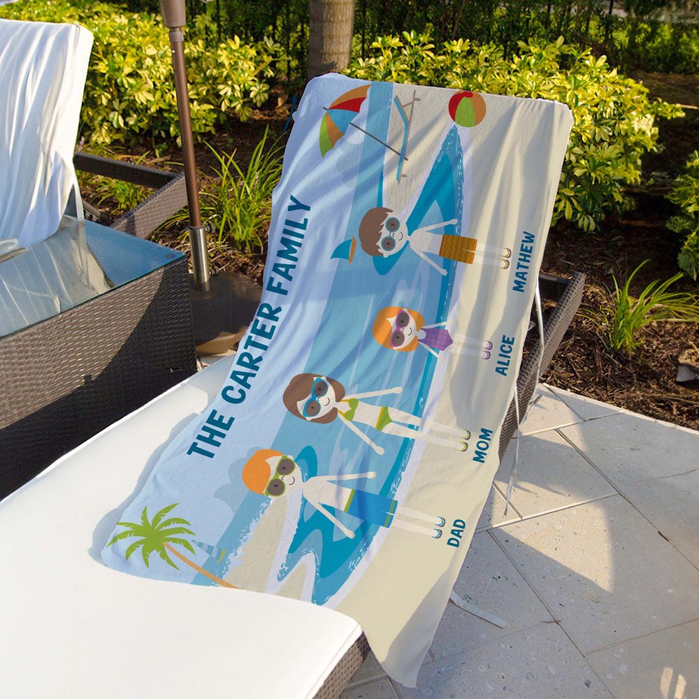 Dieses Strandtuch zeigt eine lebhafte Strandszene mit Cartoon-Figuren und lustigen Elementen wie Palmen, einem Strandball und einem Sonnenschirm. Das Design des Handtuchs ist hell und fröhlich und fängt die Freude an einem Tag am Strand ein. Du kannst den Titel und die Namen deiner Liebsten individuell gestalten und Charaktere nach deinem Geschmack auswählen, um ein einfaches Strandtuch in ein bedeutungsvolles Andenken zu verwandeln.