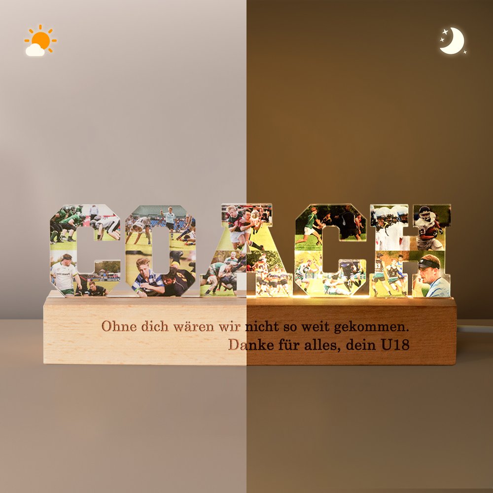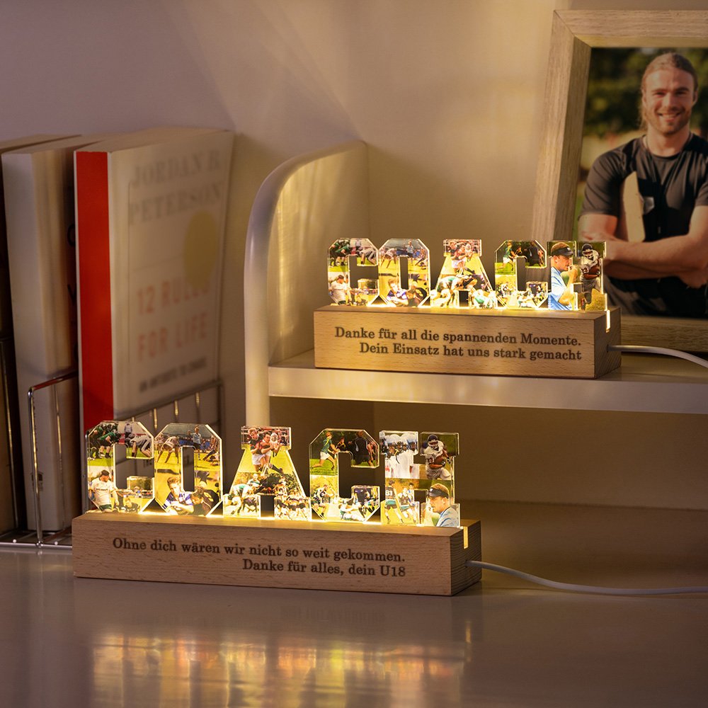 Das Hauptmotiv dieser LED-Leuchte ist das große Wort „COACH“. In der Mitte können bis zu 10 Fotos hochgeladen und zu einer Collage zusammengefügt werden, die jeden besonderen Moment des Teams festhält – vom täglichen Training bis zum Wettkampf, vom Lachen bis zum Kampf. So werden die Erlebnisse von Spielern und Trainern lebendig dokumentiert. Zusätzlich können Sie Texte hinzufügen, um Ihre herzlichen Wünsche auszudrücken.