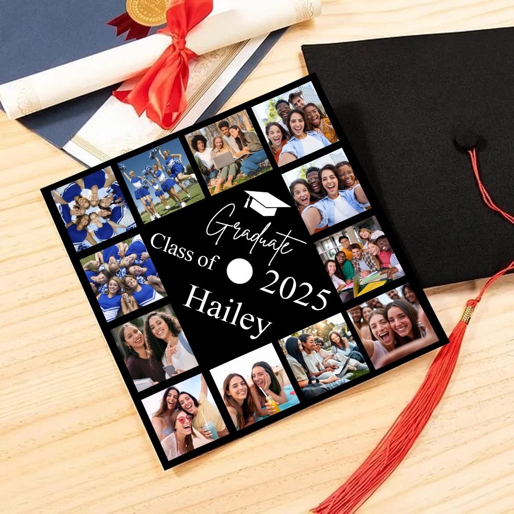 Jede Abschlusskappe ist einzigartig und kann mit 12 Fotos, dem Namen und dem Abschlussjahr bedruckt werden. Ob Ihr lächelndes Gesicht, die Campus-Szenerie oder ein Foto mit Ihren Klassenkameraden - die Abschlusskappe kann zur besonderen Dekoration Ihrer Abschlussfeier werden und ist somit Ihr exklusives Abschlusszeichen.