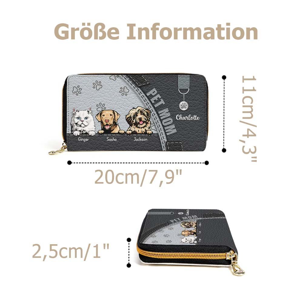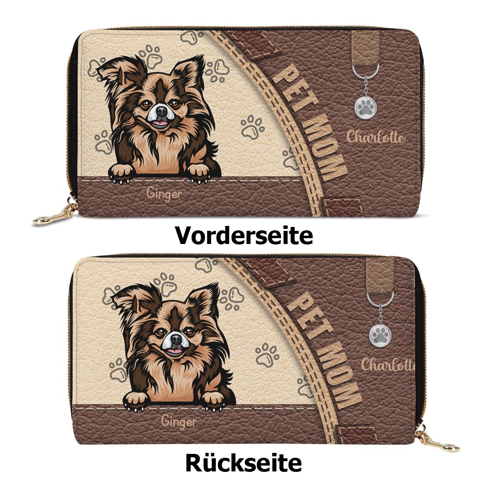 Diese Geldbörse ist in 8 verschiedenen Farben erhältlich. Ihr Design ist stilvoll und einzigartig. Die Vorderseite der Geldbörse ist mit 1-3 Porträts von Haustieren bedruckt und die rechte Seite ist mit den Worten „PET MOM“ bedruckt. Sie können die Geldbörse auch mit dem Namen Ihres Haustiers personalisieren.