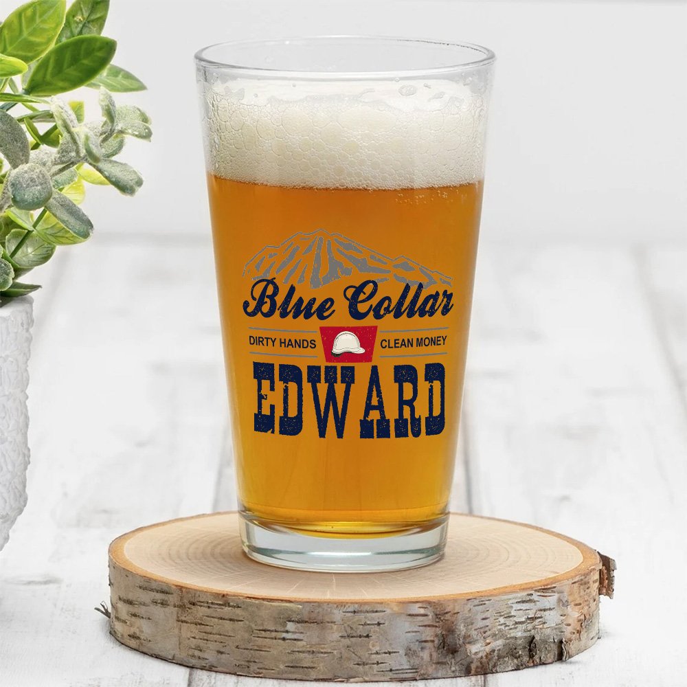 Dieses Bierglas zeigt ein modisches Design mit Bergen und einer roten Sonnenillustration sowie den Schriftzug "Blue Collar" und einen anpassbaren Namen. Es verleiht deinem Trinkerlebnis eine lustige Note.