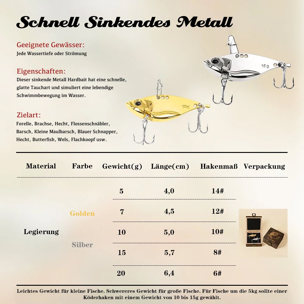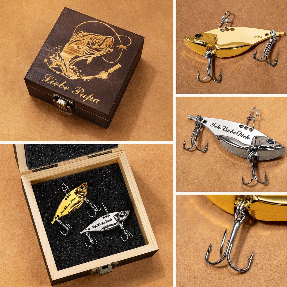 Dieser bionische Köder ist sehr dreidimensional, genau wie ein echter Fischköder. Ein Set besteht aus einem Holzkasten mit Retro-Design, auf deren Vorderseite ein festes Angelmuster und ein personalisierter Text eingraviert sind. Im Inneren befinden sich zwei Köder, ein goldener und ein silberner, die in 5 Gewichten erhältlich sind und sich für verschiedene Angelsituationen eignen. Die metallische Oberfläche und das realistische Design machen diese Köder zu etwas Besonderem und bieten Anglern ein aufregendes Angelerlebnis.