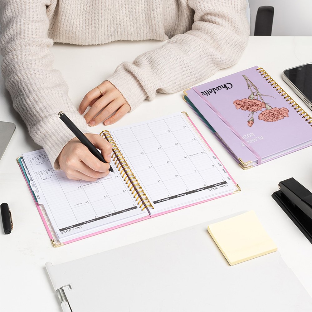 Im Mittelpunkt dieses Notizbuchs steht eine Geburtsblume im Vintage-Stil, die einen klassischen und eleganten Eindruck vermittelt. Besonders bemerkenswert ist die Option, das Notizbuch mit einem persönlichen Namen zu versehen. Dadurch entsteht ein individueller Planer, der praktische Nutzbarkeit und ansprechendes Design perfekt kombiniert.