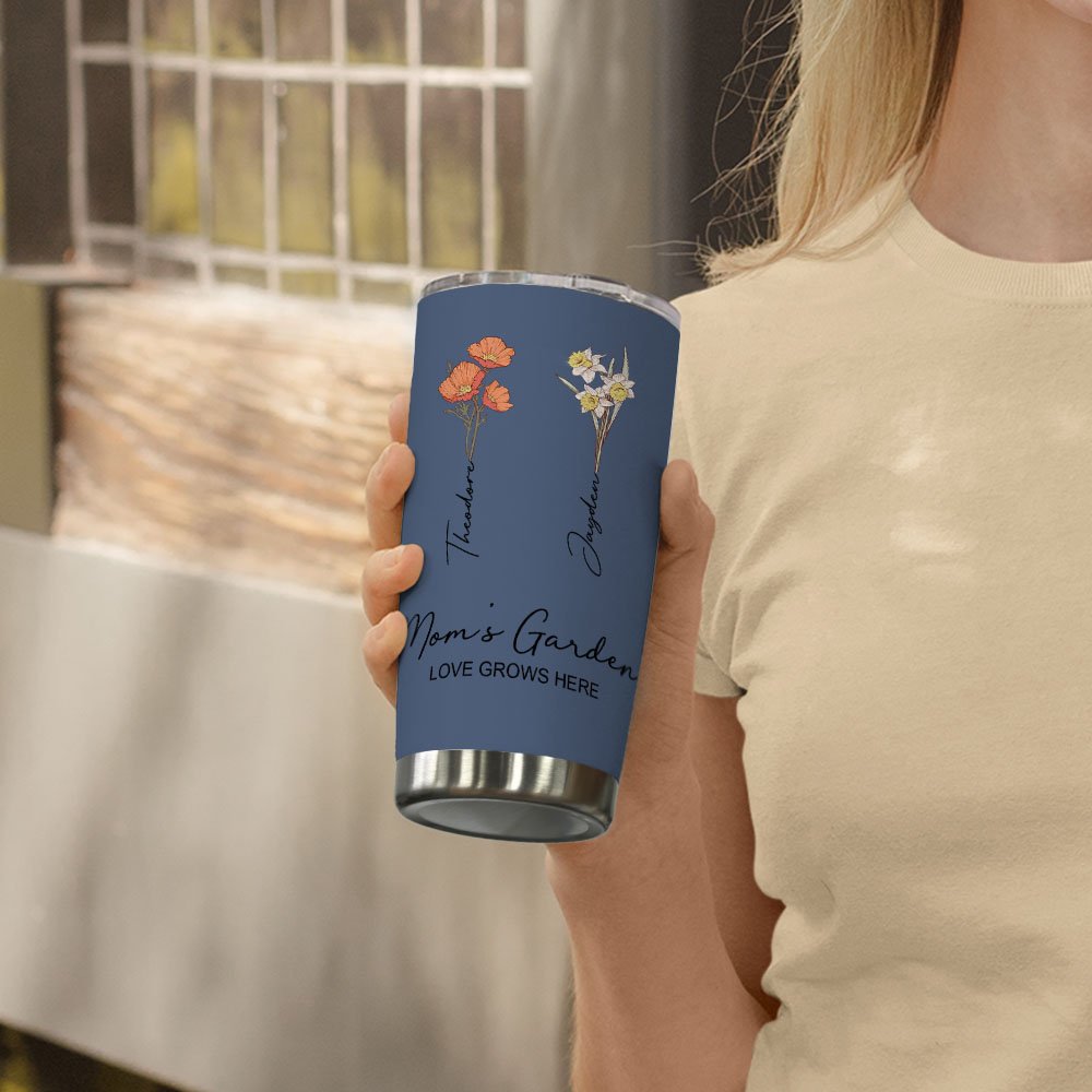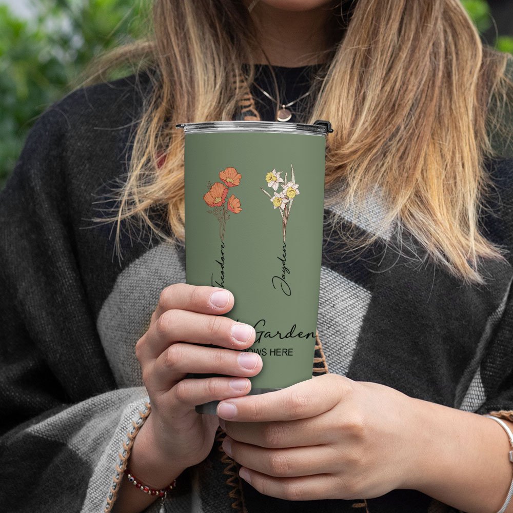 Sie können den Becher mit 1-15 Familiennamen individuell gestalten, um die Liebe und das Wachstum Ihrer Familie zu symbolisieren. Zusätzlich wird jeder Name von der entsprechenden Geburtsblume begleitet, was eine persönliche Note verleiht und die einzigartige Verbindung zu jedem Familienmitglied feiert.