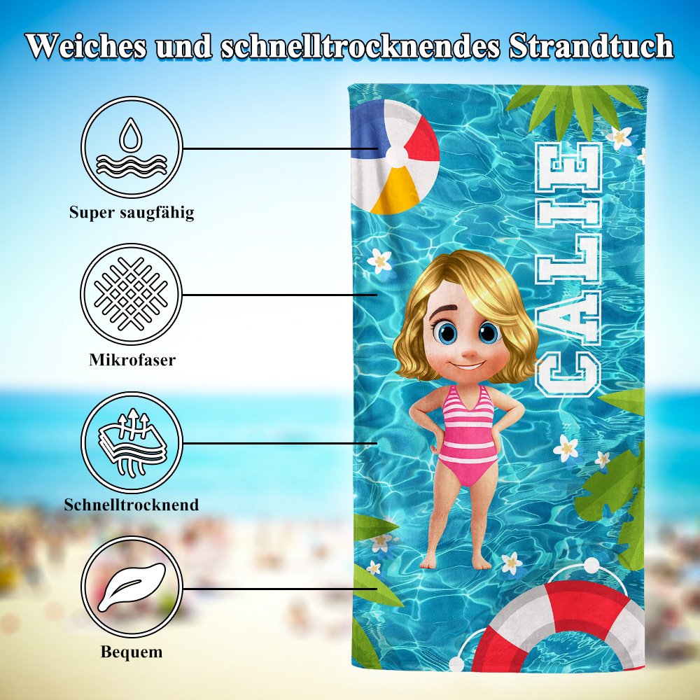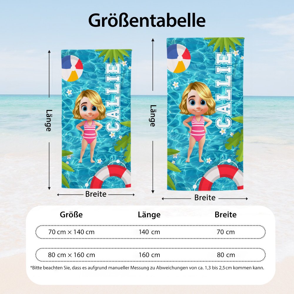 Dieses Strandtuch zeigt ein lebhaftes Design mit 3D-Cartoon-Figuren vor einem Pool-Hintergrund und bringt ein Gefühl von Spaß und Freude in Ihre sommerlichen Wasseraktivitäten. Sie können aus verschiedenen niedlichen 3D-Charakteren wählen und sie mit Ihrem Namen oder einem speziellen Text personalisieren, was dieses Strandtuch zu einem einzigartigen persönlichen Gegenstand macht.