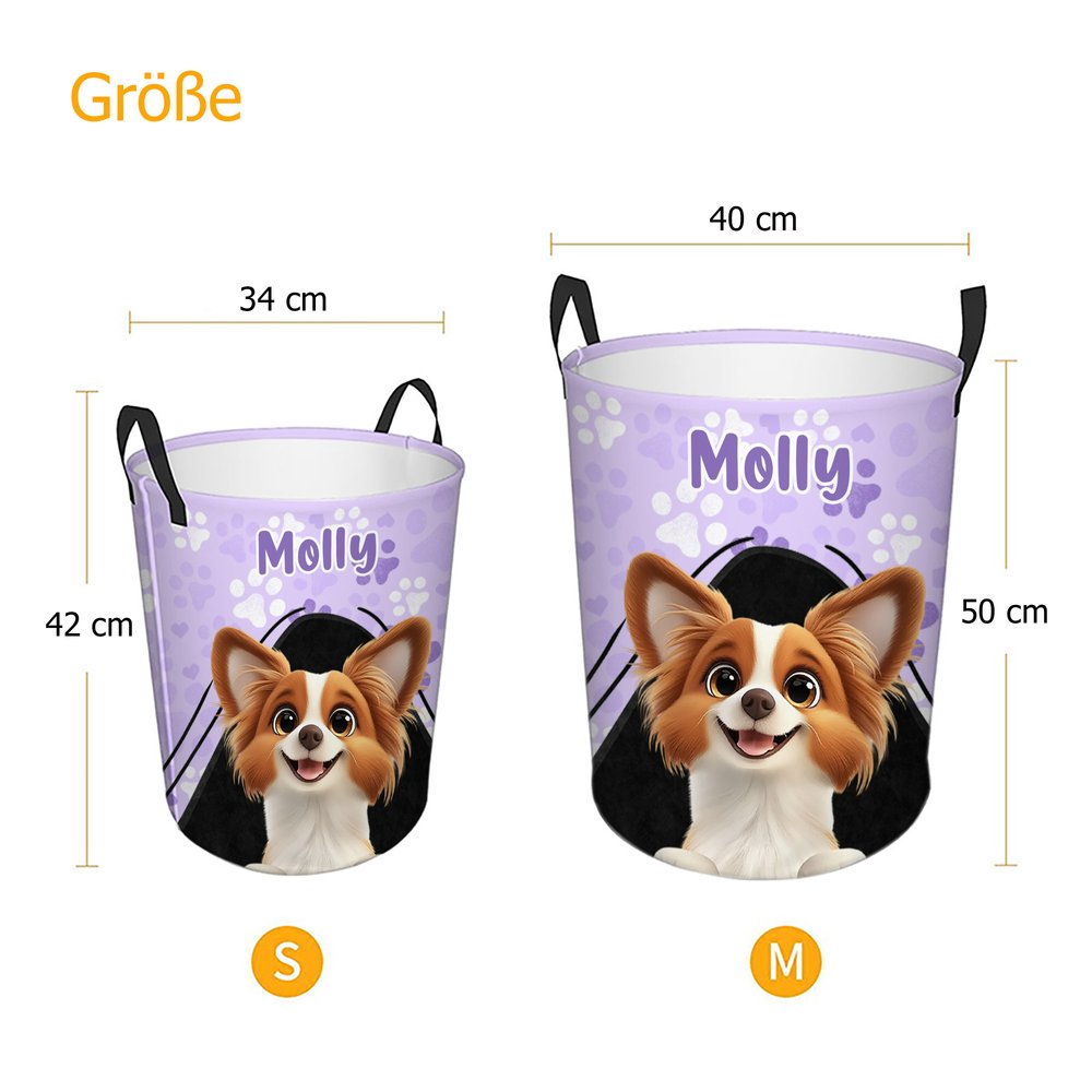 Unser Spielzeugkorb überzeugt durch ein liebevoll gestaltetes 3D-Cartoon-Hundemotiv, das die individuelle Persönlichkeit und den Charakter Ihres Vierbeiners wunderbar zum Ausdruck bringt. Sie können die Hunderasse auswählen und den Namen Ihres Hundes hinzufügen. Zusätzlich lässt sich der Hintergrund mit Pfotenabdrücken gestalten, um dem Korb eine verspielte und persönliche Note zu verleihen.