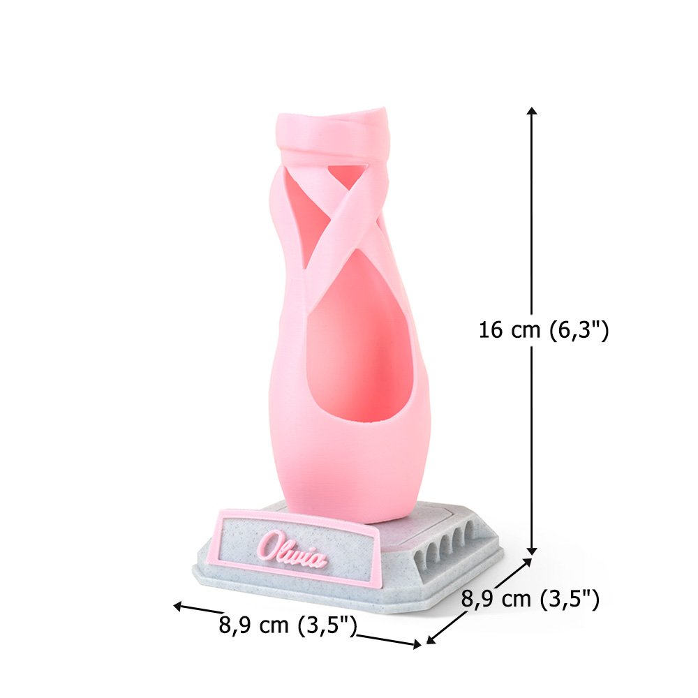 Dieser Ballett-Spitzenschuh wurde aus haltbarem PLA-Material im 3D-Druckverfahren gefertigt. Er ist auf Langlebigkeit ausgelegt und behält dabei seinen ästhetischen Charme. Die robuste Konstruktion und der beschwerte Boden gewährleisten eine hohe Widerstandsfähigkeit gegen regelmäßigen Gebrauch. Er eignet sich zur Aufnahme von Schminkpinseln mit einem maximalen Durchmesser von 1,5 cm sowie von Stiften und Blumen in Standardgröße.