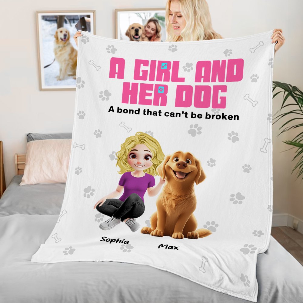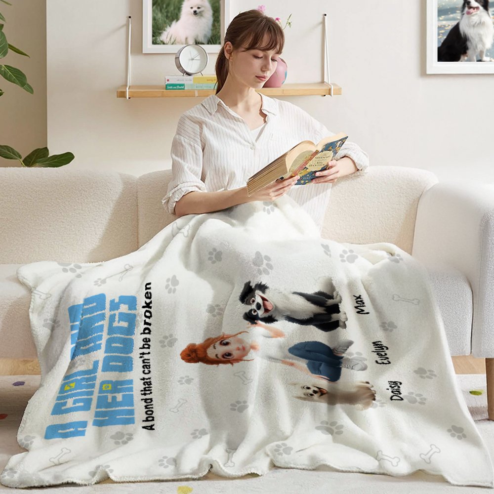 Diese Decke zeigt ein 3D-Cartoon-Motiv, das liebevoll die enge Verbindung zwischen einem Mädchen und ihrem Hund darstellt. Bedruckt ist sie mit einem niedlichen Mädchen und ein bis fünf Hunden. Außerdem können Sie Ihren eigenen Namen sowie den Namen Ihres Haustiers hinzufügen, wodurch die Decke zu einem einzigartigen und persönlichen Erinnerungsstück wird. Der sorgfältig gestaltete Schriftzug A GIRL AND HER DOG, A bond that can't be broken (Ein Mädchen und ihr Hund – eine unzerbrechliche Verbindung) verleiht dem Design eine besondere emotionale Tiefe und erzählt eine bewegende Geschichte.