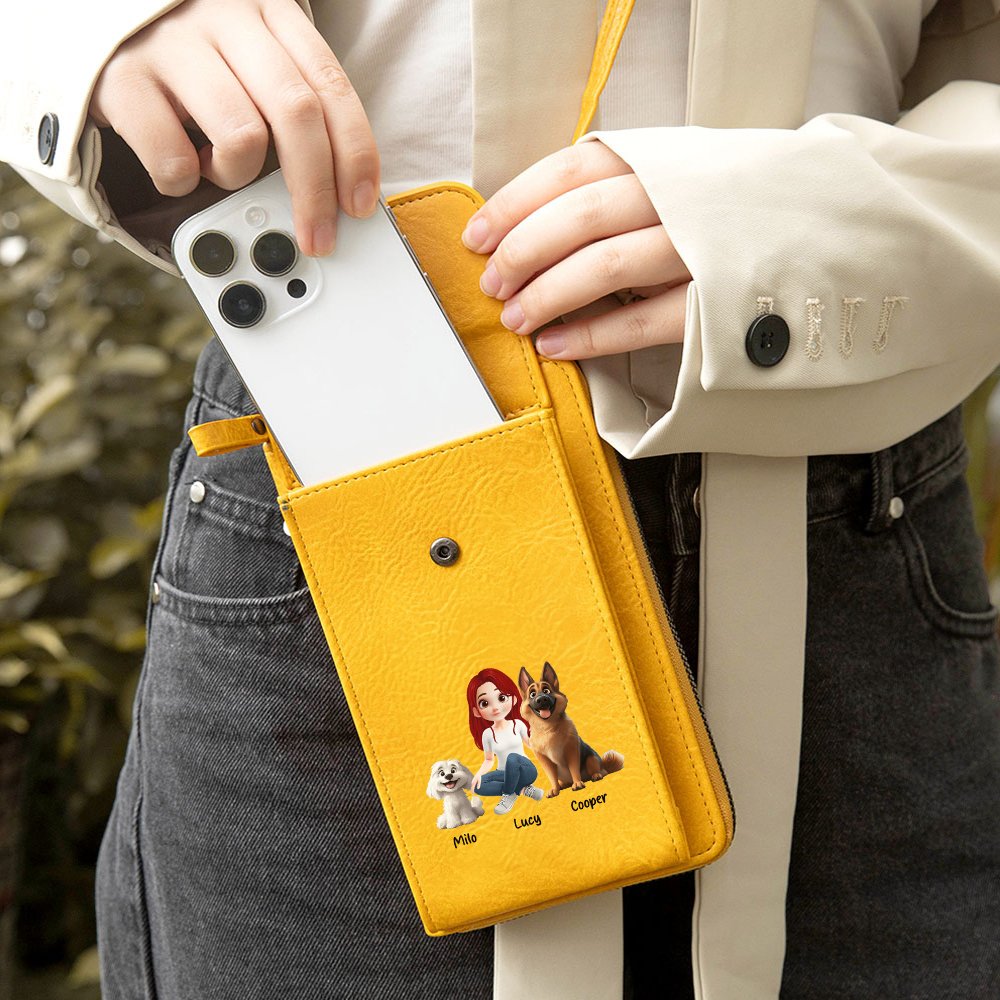 Diese Crossbody-Brieftasche verwendet anpassbare Cartoonfiguren und Haustierdesigns. Du kannst das Design der Figuren und die Hunderassen nach deinen Wünschen auswählen und darunter einen persönlichen Namen einfügen, der das Portemonnaie zu einem warmen Andenken macht. Außerdem sind auf der Vorderseite der Geldbörse emotionale Slogans wie "A Girl and Her Dog" und "A Bond That Can't Be Broken" zu sehen, die das gesamte Design noch erzählerischer und emotionaler machen.