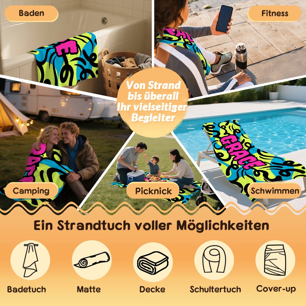 | Merkmale: | Super saugfähig, schnelltrocknend, strapazierfähig und weich, sandfrei, überdimensioniert, leicht und tragbar, abstraktes Graffiti-Design |