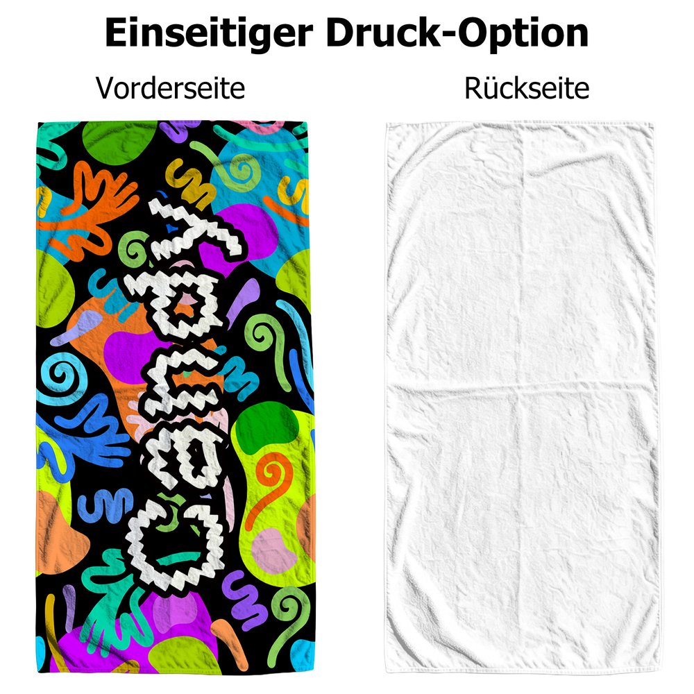 Dieses Strandtuch zeigt einen trendigen, abstrakten Graffiti-Stil mit kräftigen Farbblocklinien und verspielten Elementen, die einen coolen Street-Vibe in Ihre Sommertage bringen. Personalisieren Sie es mit einem individuellen Namen – ob mit lustiger Pixelkunst oder künstlerischen Graffiti-Schriftzügen – und machen Sie Ihr Strandtuch zu einem Unikat.