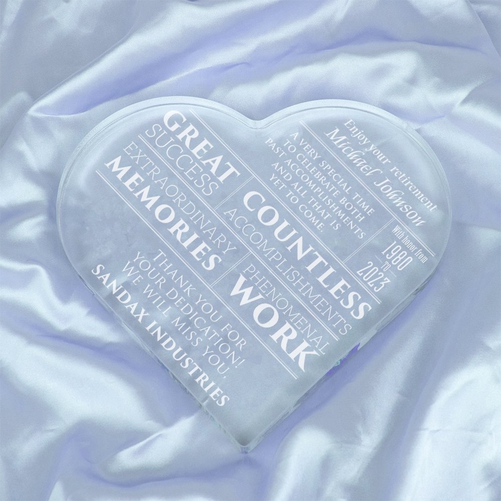 Diese Plakette ist aus strapazierfähigem Acryl gefertigt und wird jahrelang ihr makelloses Aussehen behalten. Das schlichte Design und die hochwertige Konstruktion machen sie zu einem zeitlosen Andenken. (SINNVOLLES GESCHENK ZUM RUHESTAND): Diese personalisierte Acryltafel in Herzform ist die perfekte Art, den Ruhestand eines geliebten Menschen zu würdigen. Mit der Möglichkeit, die Nachricht individuell zu gestalten, verleiht sie dem Geschenk eine persönliche Note.