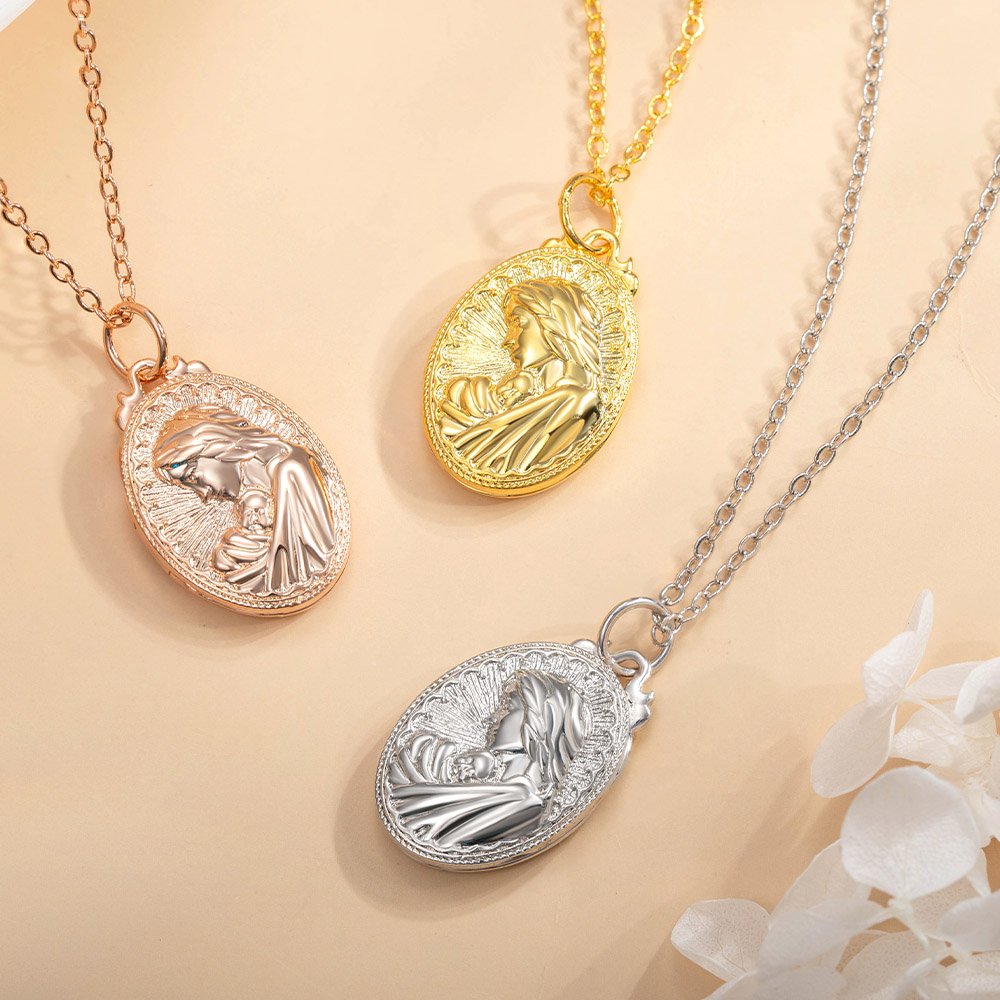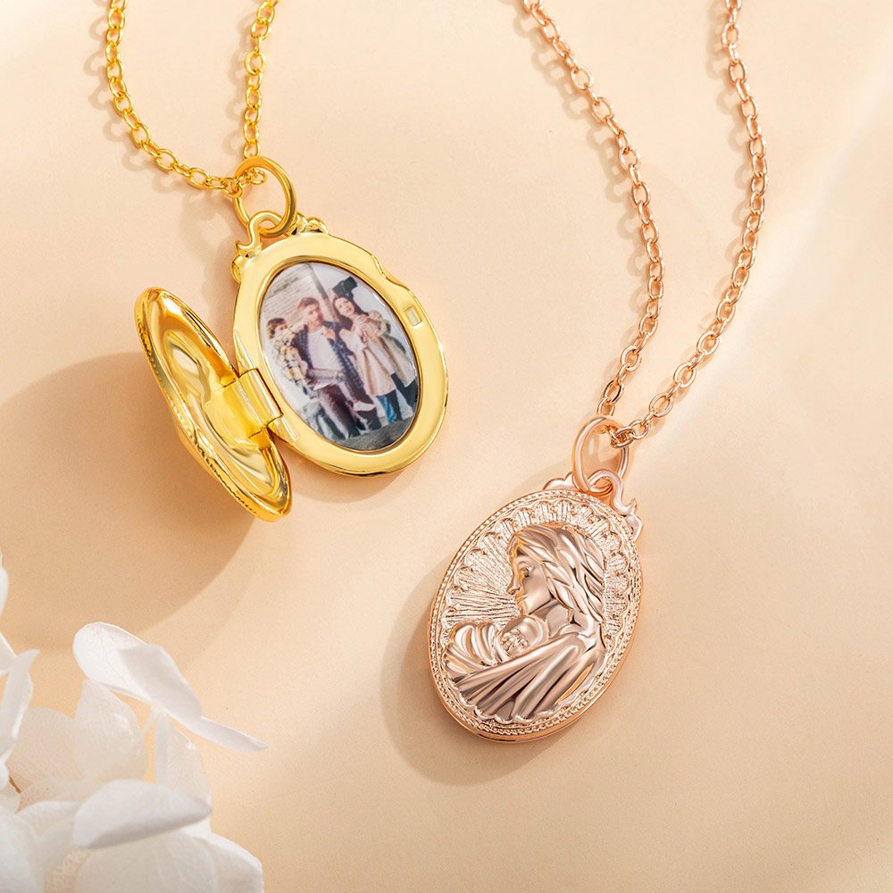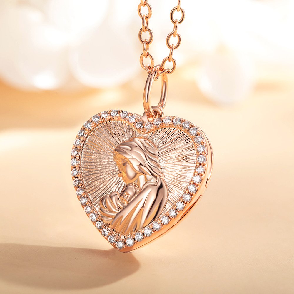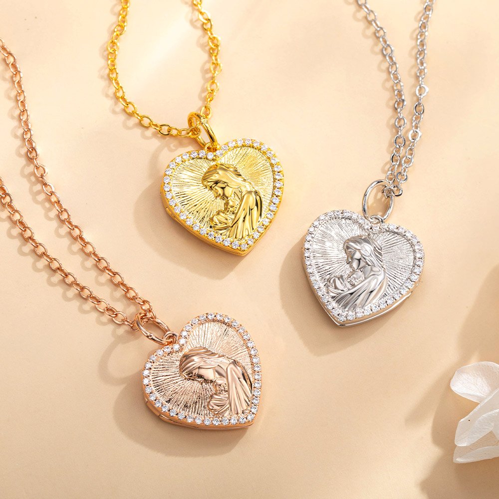 Das Medaillon ist mit funkelnden Zirkonsteinen verziert, die ihm einen eleganten und auffälligen Touch verleihen. Die Zirkone heben das Bild der Mutter wunderschön hervor und schaffen ein atemberaubendes Schmuckstück, das die Schönheit und Reinheit der Liebe einer Mutter repräsentiert.