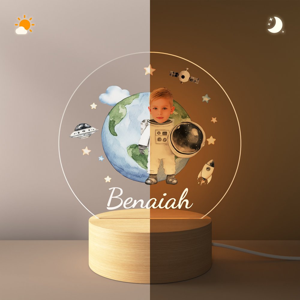 Das Nachtlicht ist im Universum gestaltet und verfügt über einen geheimnisvollen interstellaren Hintergrund, acht Planeten und das Sonnensystem zur Auswahl sowie einen kleinen Astronauten mit einem anpassbaren Avatar. Sie haben die Möglichkeit, ein Foto des Gesichts Ihres Kindes hochzuladen und einen Namen hinzuzufügen, um einen nächtlichen Begleiter zu schaffen.