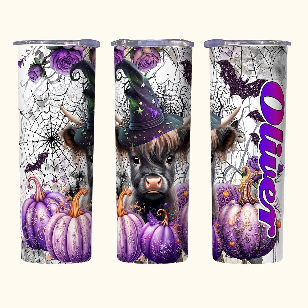 Dieser 20-Unzen-Becher zeigt eine unwiderstehlich niedliche Baby-Highland-Kuh mit dem gruseligen Aussehen einer Hexe und verleiht Ihren Halloween- und Thanksgiving-Feierlichkeiten einen Hauch von Charme.