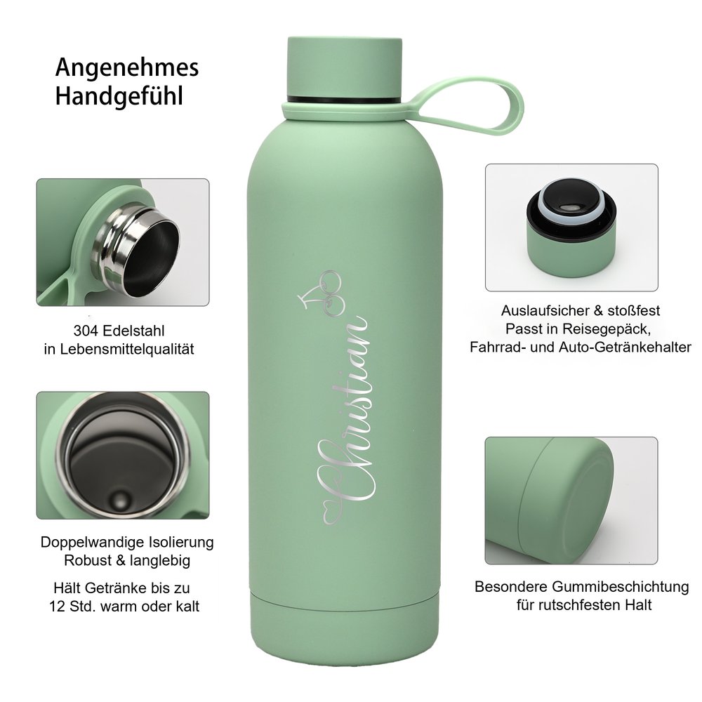 Das doppelwandige, vakuumisolierte Material besteht aus lebensmittelechtem Edelstahl 304 und einer Gummibeschichtung, die eine Temperatur von mehr als 12 Stunden aufrechterhalten kann, während die Gummischicht verhindert, dass die Flasche aus der Hand rutscht. Auslaufsichere Schraubverschlüsse und Wasserauslässe sorgen für eine umweltfreundliche Nutzung von kohlensäurehaltigen Getränken, Kaffee oder Tee während des Trainings oder der Arbeit.