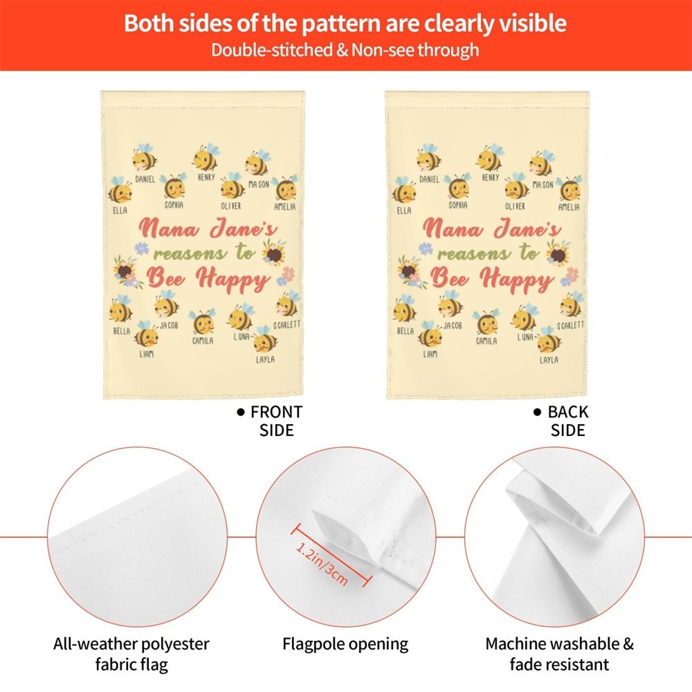 Die Fahne wird mit einem individuellen Text und 2 - 15 niedlichen kleinen Bienen mit Namen personalisiert, die jeweils ein Kind repräsentieren, das die Mutter oder die Großeltern umgibt, weil sie großartig, selbstlos und duftend sind. (VERSCHÖNERT DEN RAUM): Diese Gartenfahne ist sowohl ein Geschenk als auch ein Dekorationsartikel. Sie kann an jedem beliebigen Ort im Freien aufgehängt werden, z. B. auf einer Terrasse, Veranda, Wand oder einem Balkon, und verleiht Ihrem Zuhause einen charmanten dekorativen Stil. (LANGLEBIGES MATERIAL): Hergestellt aus Polyester, was es langlebig, maschinenwaschbar und resistent gegen Ausbleichen macht. Selbst bei Wind und Regen bleibt es so leuchtend und farbenfroh wie zuvor, und seine Widerstandsfähigkeit und Stabilität ermöglichen eine langfristige Nutzung.