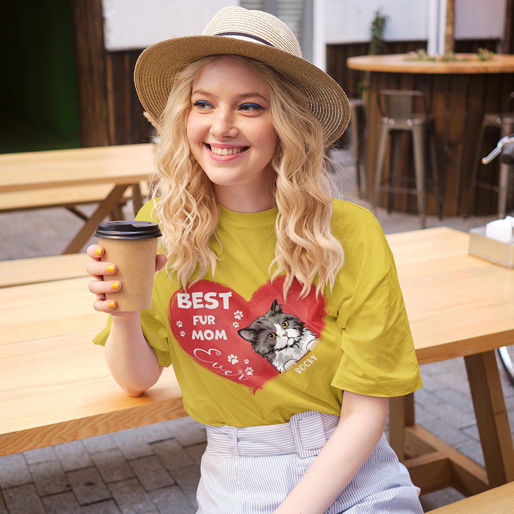 Dieses Haustier-T-Shirt ist ein personalisiertes Geschenk für Menschen, die ihre pelzigen Gefährten sehr lieben. Die Vorderseite des T-Shirts zeigt ein rotes Herz und den Satz "Best Fur Mom Ever", zusammen mit einem bezaubernden Bild eines Haustieres. Du kannst die Rasse des Tieres auswählen und seinen Namen anpassen, um deine Zuneigung für dein geliebtes Haustier auszudrücken. Das macht es zu einem perfekten Geschenk für besondere Anlässe oder als Zeichen der Wertschätzung unter Freunden.