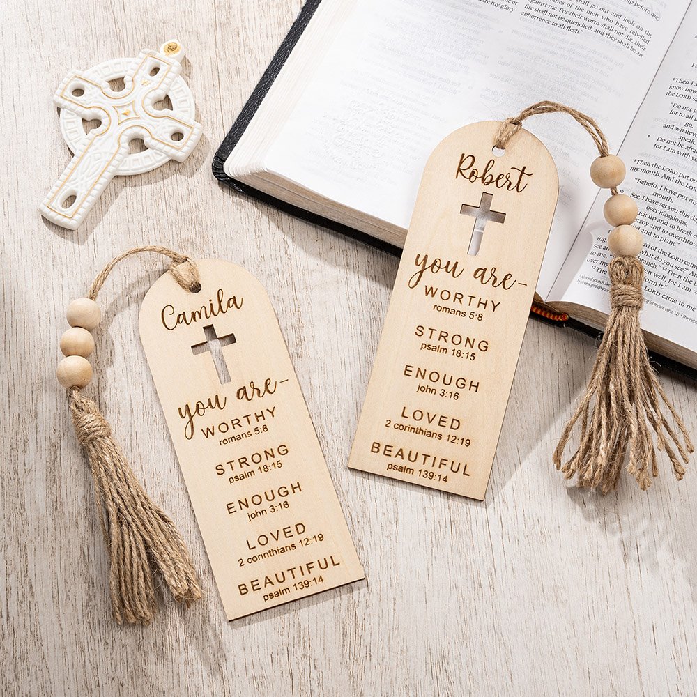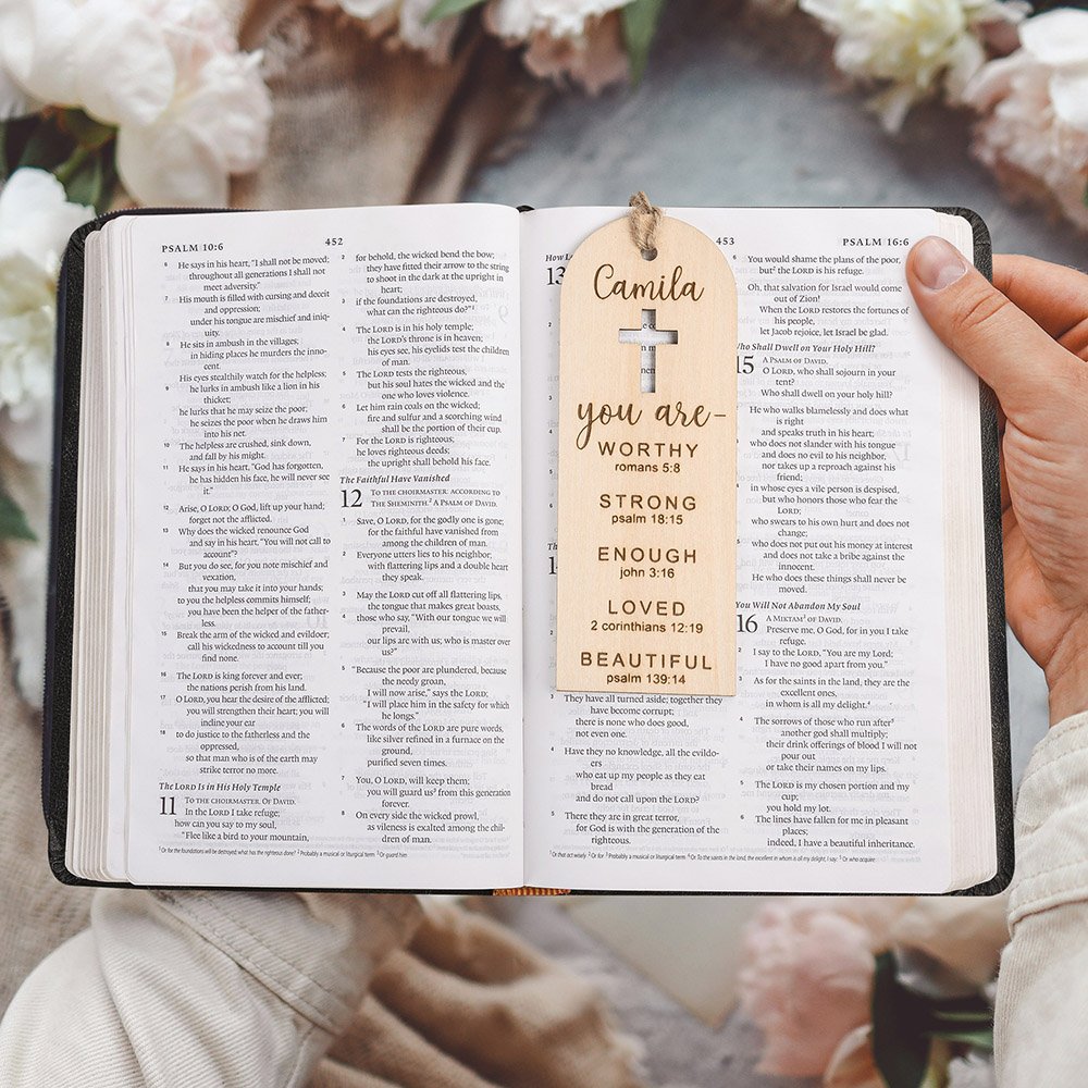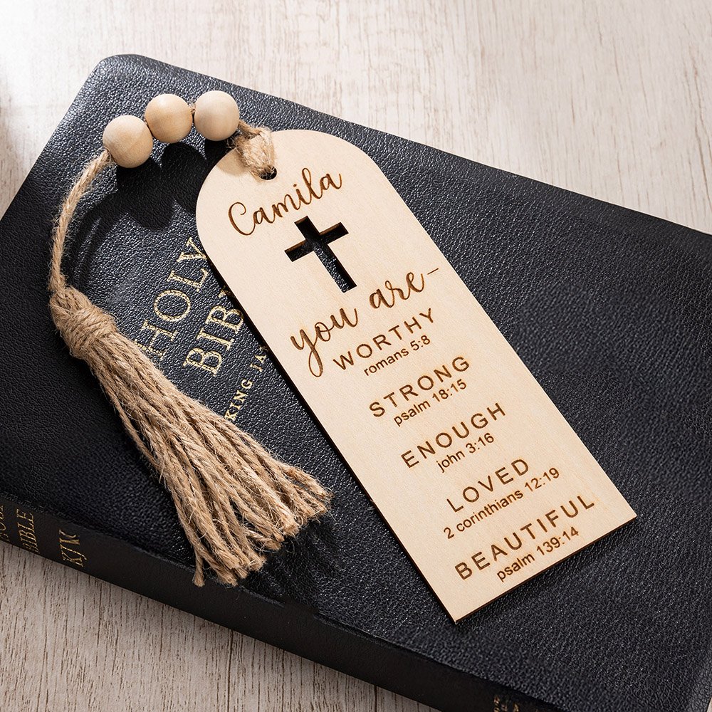 Dieses Lesezeichen kombiniert inspirierende Bibelverse mit einem feierlichen und heiligen Kreuz und bringt Ihnen Zuversicht und Ermutigung. Der auffällige Titel "Du bist" ist ein Bekenntnis zu einem unerschütterlichen Glauben. Die mit Perlen verzierte Quaste verleiht dem Lesezeichen einen Hauch von Retro-Stil und unterstreicht die Vielschichtigkeit und den künstlerischen Sinn des Lesezeichens. Es kann auch mit einem eingravierten Namen versehen werden, der Ihre einzigartige Persönlichkeit widerspiegelt.
