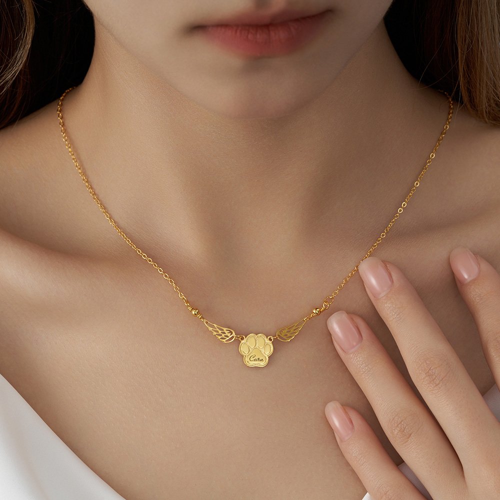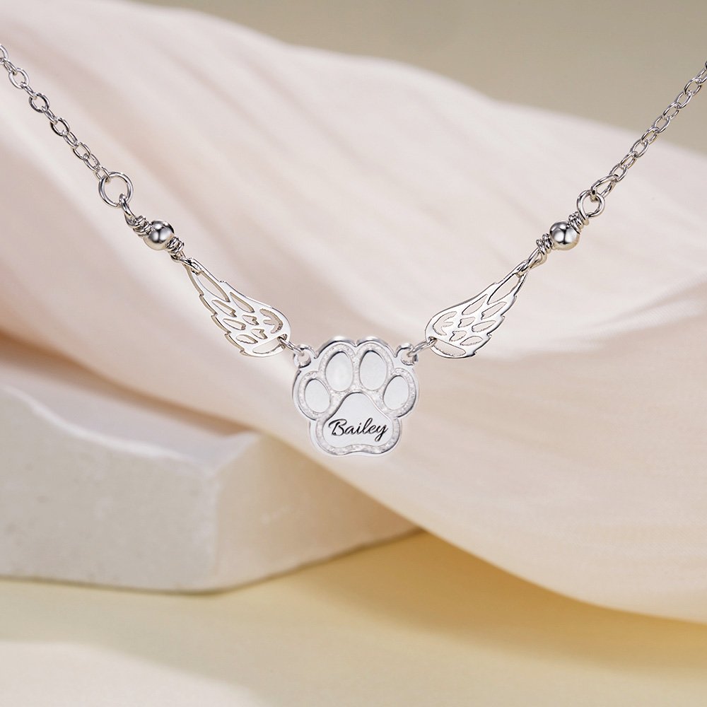 Diese Halskette kombiniert die Sanftheit von Engelsflügeln mit der Wärme von Haustierpfotenabdrücken, was bedeutet, dass Haustiere wie Engel sind, die dich begleiten, und selbst wenn du weit weg bist, wirst du dich immer noch in deinem Herzen an sie erinnern. Die Halskette hat ein doppelseitiges hohles Flügeldesign, das die Schönheit von Leichtigkeit und Beweglichkeit zeigt. Sie kann mit dem Namen Ihres Haustieres individuell gestaltet werden und ist somit ein einzigartiger Erinnerungsschmuck, mit dem Sie immer an Ihr Haustier denken.