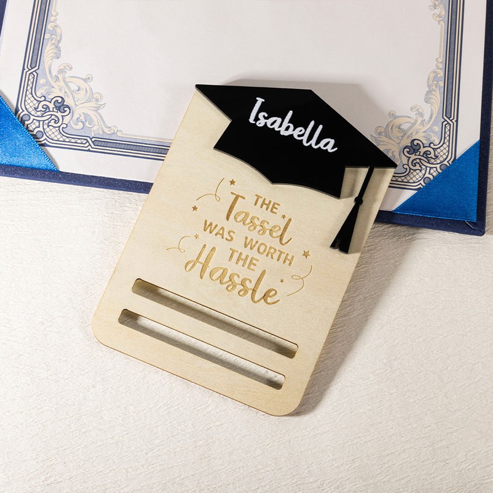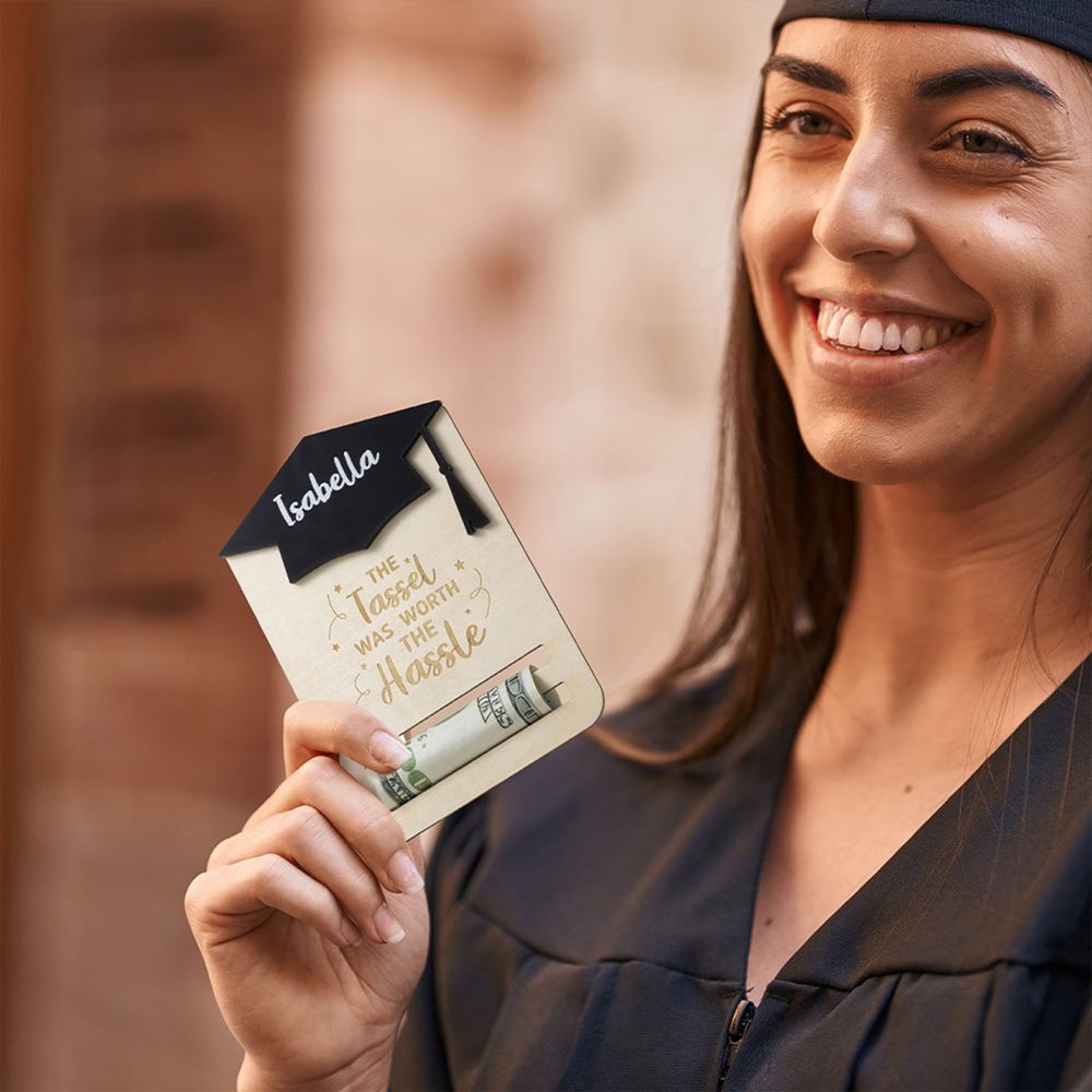 Feiern Sie die Abschlussfeier mit einem durchdachten und einzigartigen Geschenk! Dieser personalisierte Geldhalter ist aus hochwertigem Birkenholz gefertigt und verfügt über ein elegantes Akademikerhut-Design aus Acryl. Er ist die ideale Art, einem Absolventen oder Klassenkameraden seine Wertschätzung zu zeigen, indem er Praktisches mit sentimentalem Wert verbindet.