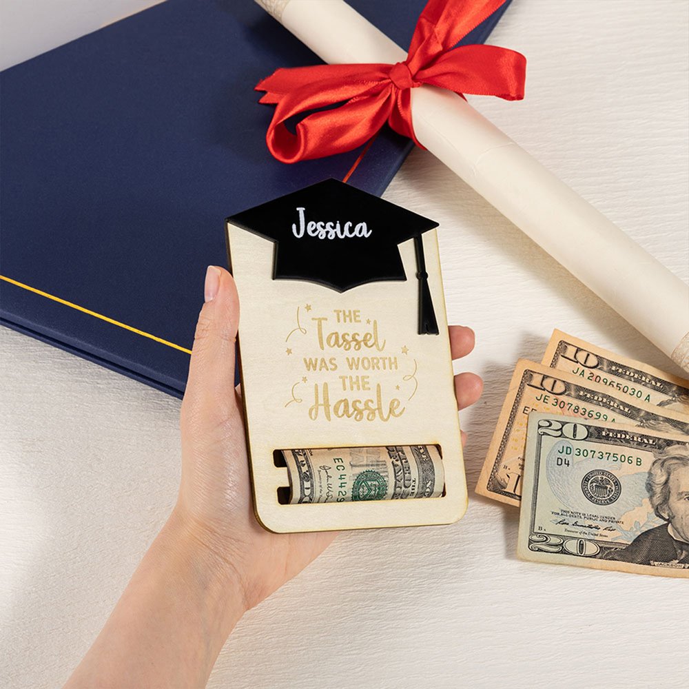 Dieses Stück ist nicht nur ein Geldhalter - es ist ein Andenken, das Absolventen für immer in Ehren halten können. Er ist nicht nur perfekt für die Aufbewahrung von Bargeld, sondern auch ein dekoratives Element für den Schreibtisch oder das Regal, das die Absolventen an ihre Leistungen erinnert.