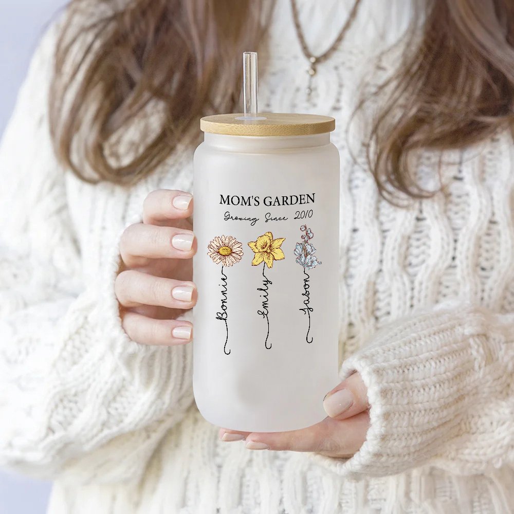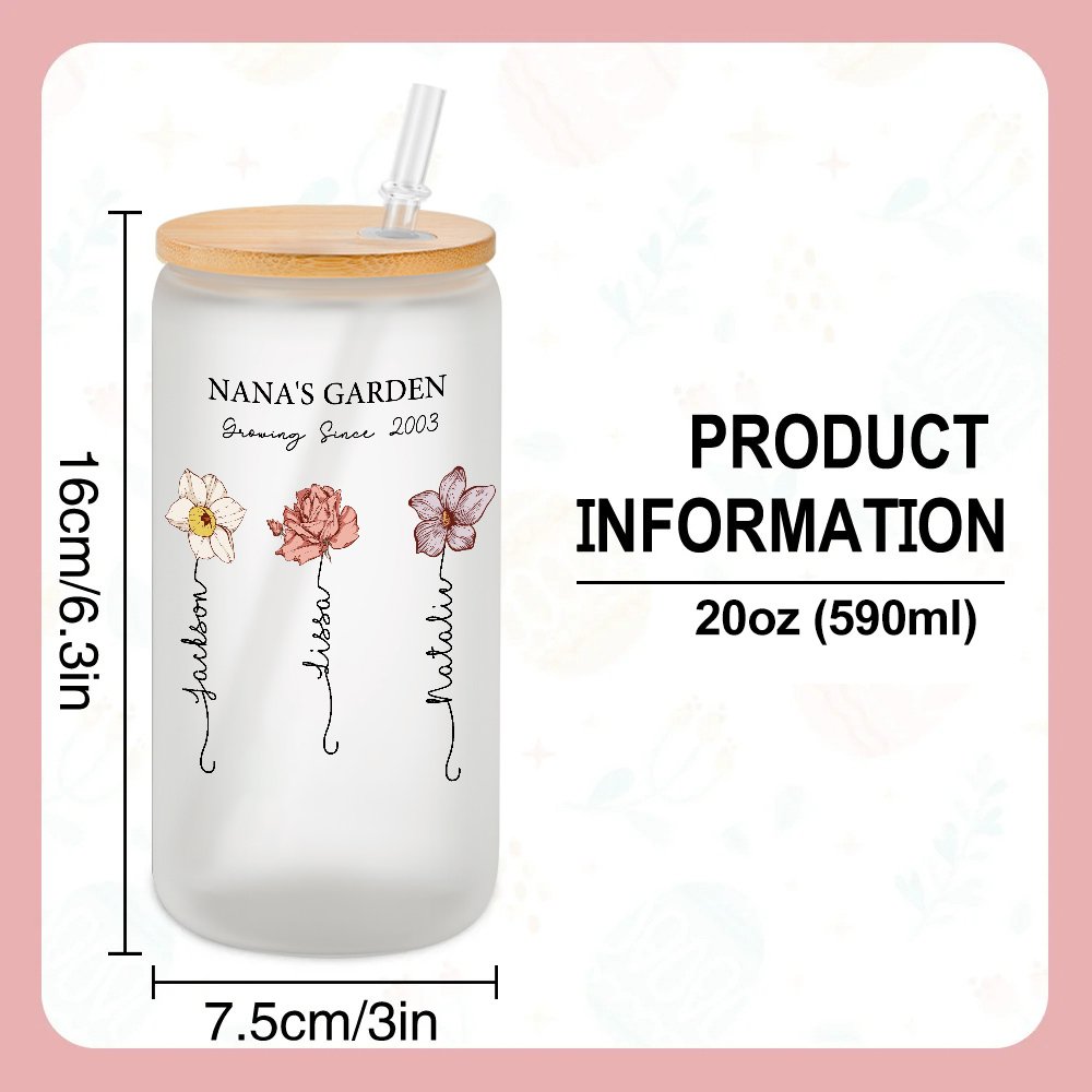 Personalisierte Omas Garten 1-12 Geburt Blumen Täglicher Gebrauch 20 oz Name Milchglasbecher mit Deckel und Strohhalm Tägliches Muttertagsgeschenk für Oma Mom