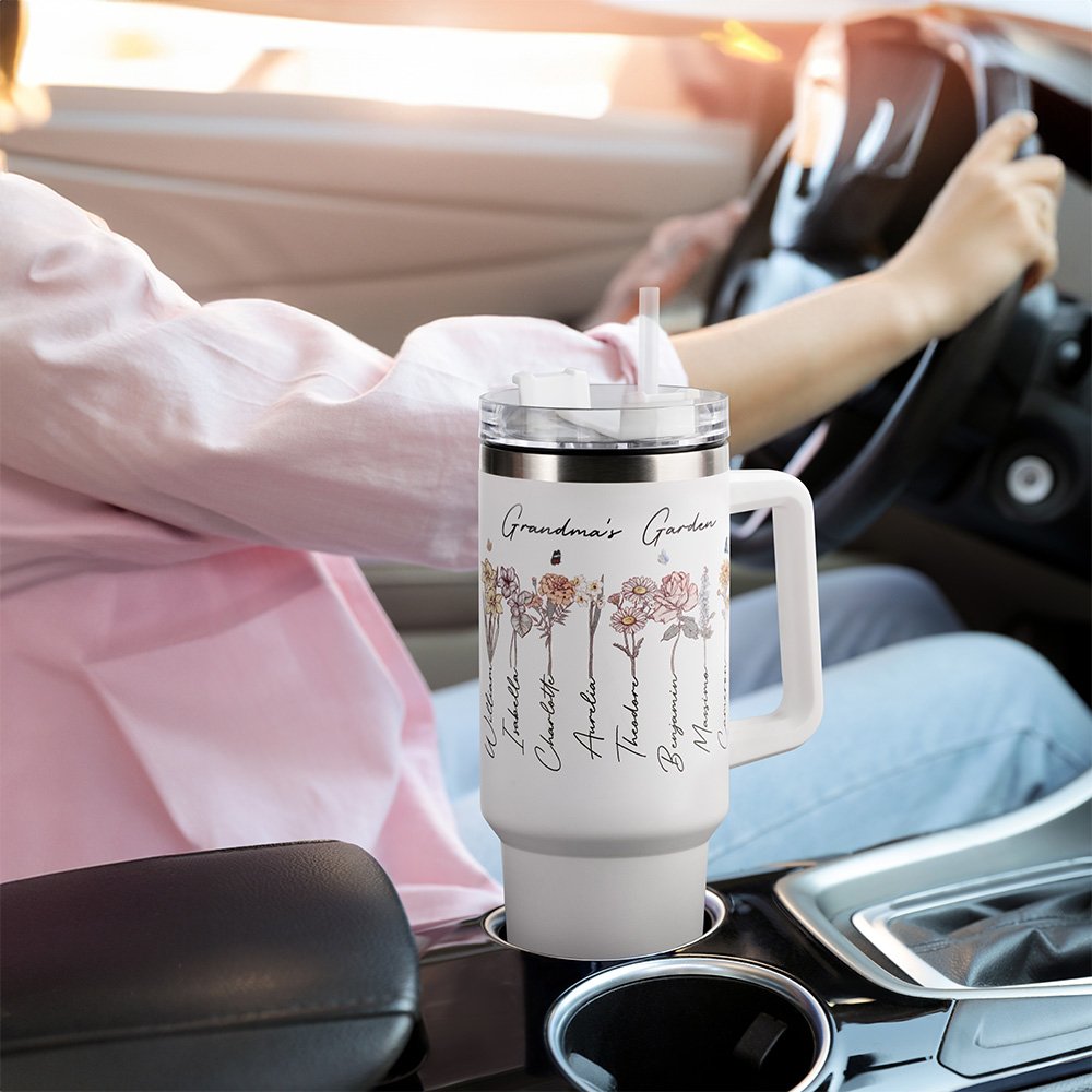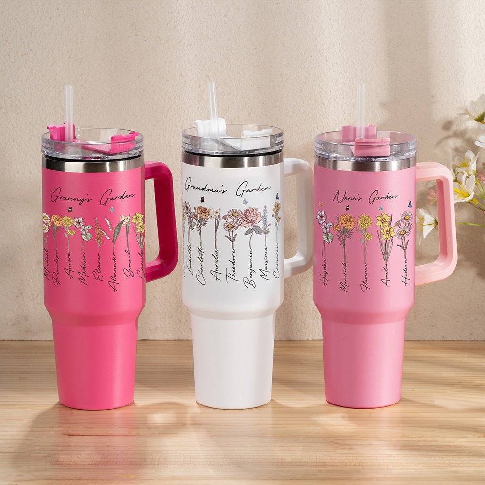 Dieser Becher ist mit einem eleganten Geburtsblumenmuster im Vintage-Stil bedruckt, das je nach Anzahl der Familienmitglieder und Geburtsmonat ausgewählt werden kann. Sie können auch Ihren oder den Namen Ihrer Familie in den Becher einarbeiten. Der Stiel der Geburtsblume, der aus dem Namen besteht, symbolisiert die enge Beziehung zwischen Ihnen und Ihrer Mutter oder Großmutter. Dieser speziell gestaltete Becher wird ein begehrtes Souvenir sein.