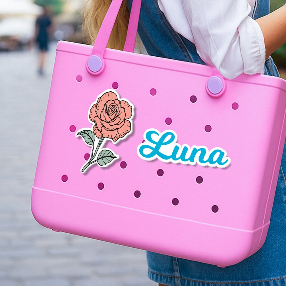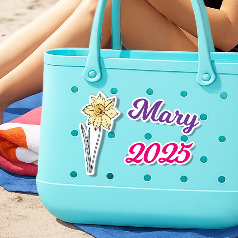 Dieser Taschenanhänger zeigt ein Design, das sich um die Geburtsblumen des Dezembers dreht, wie Narzissen, Nelken und Rosen. Jede Blume symbolisiert schöne Segnungen und Gefühle. Sie können die Geburtsblume und den Namen individuell gestalten, um ein einzigartiges Taschen-Accessoire zu schaffen, das Ihren Stil widerspiegelt.