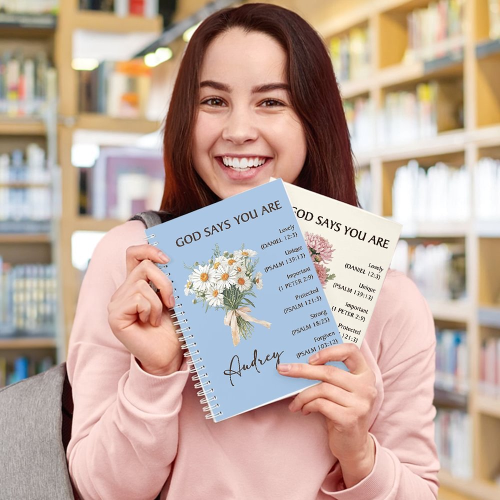Dieses Notizbuch ist mit einer Kombination aus Geburtstagsblumen und biblischem Text gestaltet. "Gott sagt, du bist" vermittelt Gottes Ansichten und Segen für die Menschen und drückt einen tiefen religiösen Glauben und spirituellen Trost aus. Jedes Notizbuch wird mit einem Namen bedruckt, was es einzigartig macht.