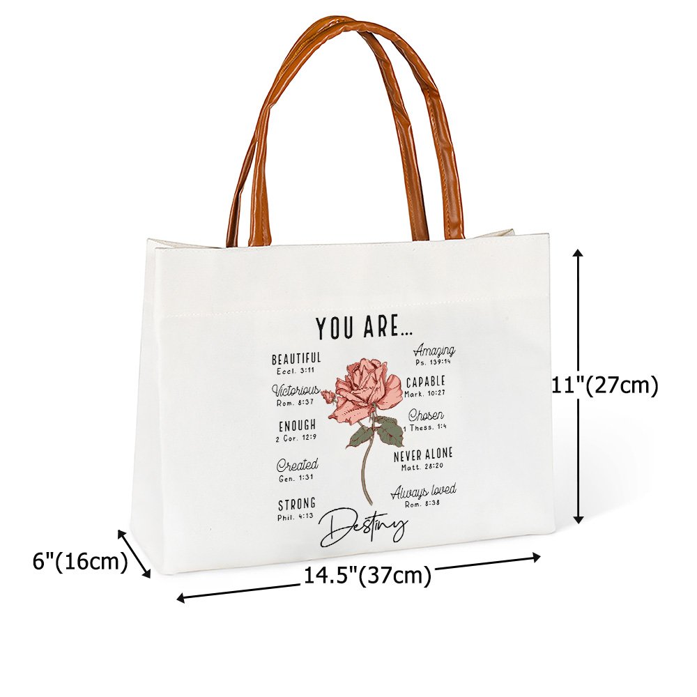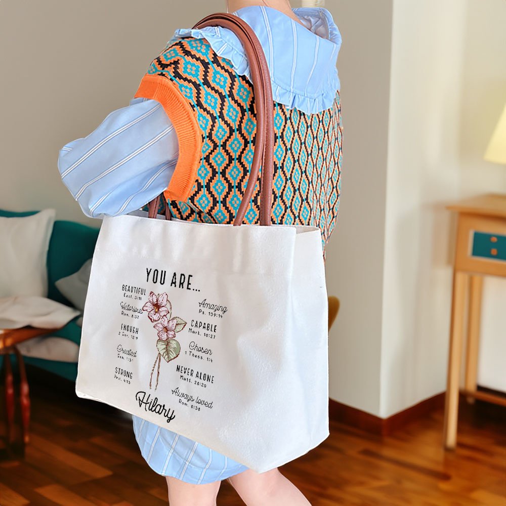 Die Tasche ist mit inspirierenden Schriften wie "Du bist schön, stark ..." und schöne Geburt Blumenmuster, die nicht nur die Macht des Glaubens zeigen, sondern geben ihm auch eine personalisierte Schönheit gedruckt. Darüber hinaus kann die Tasche auch einen Namen angepasst unterstützen, so dass es ein einzigartiges persönliches Element.