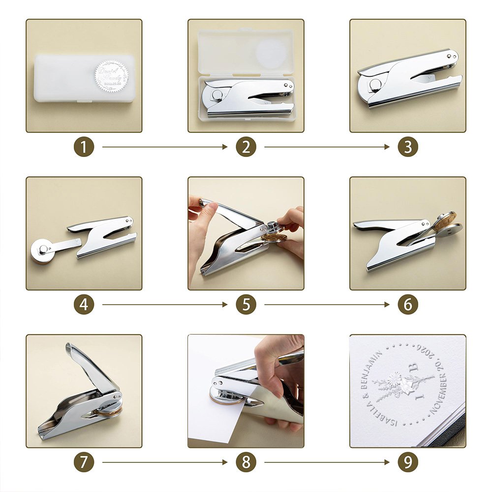 Dieser Prägestempel ist für den vielseitigen Einsatz bei einer Vielzahl von Projekten und Anlässen konzipiert. Er eignet sich perfekt, um Hochzeitseinladungen, private Unterschriften, Fälschungsschutzmarken, Briefpapier, Umschläge, Geschäftsdokumente und Briefpapier für Veranstaltungen mit persönlichen Aufdrucken zu versehen. Sie können sogar wunderschöne Prägemuster auf Servietten, Alufolie und anderen Papiermaterialien erstellen, die jedes Stück einzigartig und elegant machen. Darüber hinaus eignet er sich ideal für die Kennzeichnung von Lieblingsbüchern, kalligrafischen Werken, Urkunden und Sammlerstücken und dient als unvergessliches Andenken oder als eleganter Teil Ihrer Schreibwarensammlung.