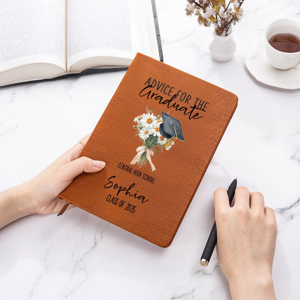 Dieses personalisierte A5-Notizbuch wurde für die Abschlussklasse des Jahres 2025 entworfen und zeigt ein lebendiges Blumenmuster in Kombination mit Elementen einer Abschlusskappe auf dem Cover. Sie können das Notizbuch mit dem Namen des Absolventen, dem Namen der Schule und dem Jahr des Abschlusses personalisieren und ihm so eine einzigartige persönliche Note verleihen, die es zu einem besonderen Andenken an die Abschlussfeier macht.