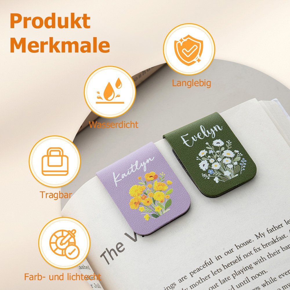 Diese Lesezeichen zeichnen sich durch ein schlichtes und zugleich elegantes Design aus und sind mit der jeweiligen Geburtsblume des Monats verziert. Jede Geburtsblume steht für unterschiedliche Wünsche und positive Eigenschaften und kann zudem mit Ihrem Namen personalisiert werden. Dadurch vereinen die Lesezeichen natürliche Schönheit, glücksbringende Bedeutungen und individuelle Elemente, heben sich von gewöhnlichen Lesezeichen ab und unterstreichen perfekt das besondere Leseritual von Bücherliebhabern.