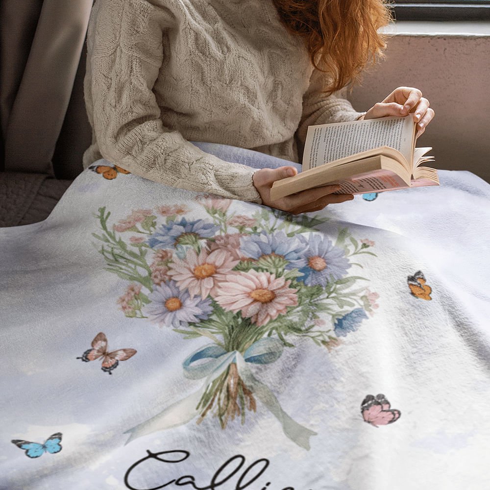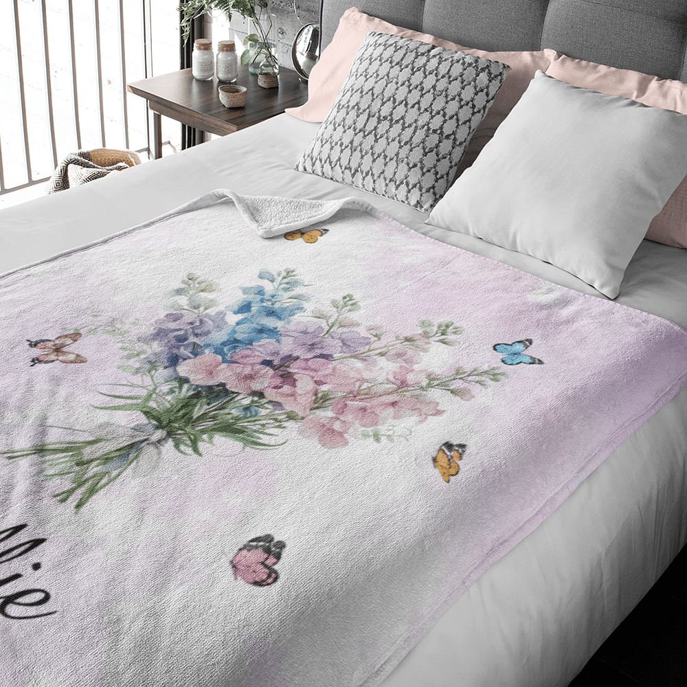 Unsere Decke besticht durch ihr einzigartiges Design. Der Aquarellhintergrund mit zarten Geburtstagsblumenmustern und Schmetterlingselementen verleiht ihr einen klassischen und eleganten Touch. Jede Geburtstagsblume steht für ein Familienmitglied, und der kombinierte Blumenstrauß symbolisiert eine liebevolle Familie. Sie können Ihren Namen unter dem Strauß anbringen, um ihn noch herzlicher zu gestalten.