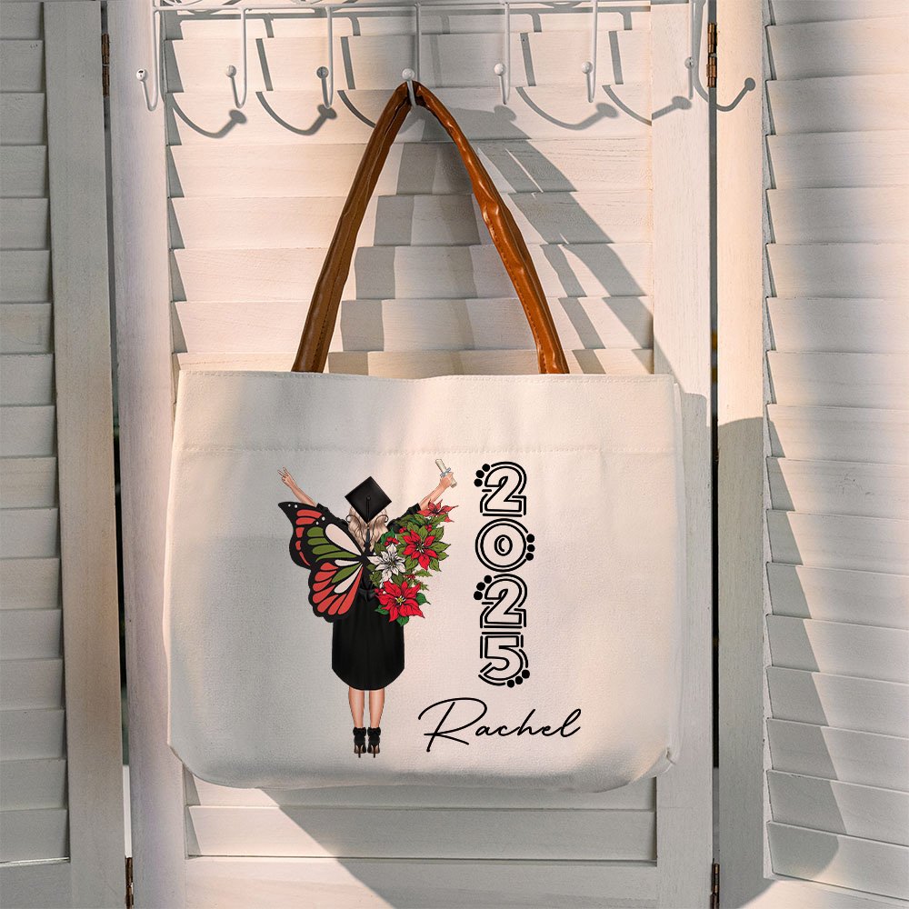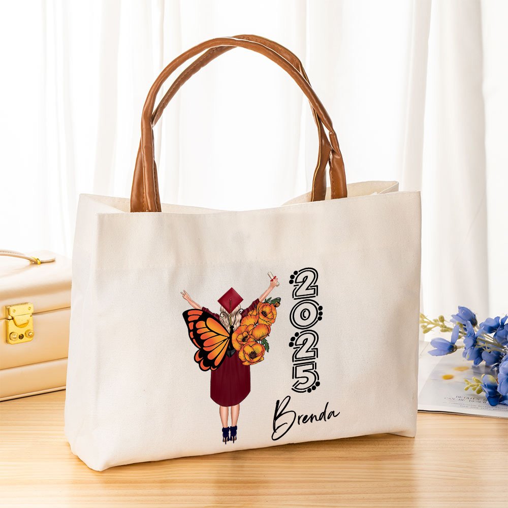 Diese einzigartige Tragetasche aus Segeltuch zeigt einen Cartoon-Absolventen in einer Junggesellenrobe mit schönen Geburtstagsblumen und Schmetterlingsmustern, die sowohl schön als auch bedeutungsvoll sind. Sie können Ihr Abschlussjahr und Ihren Namen hinzufügen, um Ihren akademischen Meilenstein zu feiern.