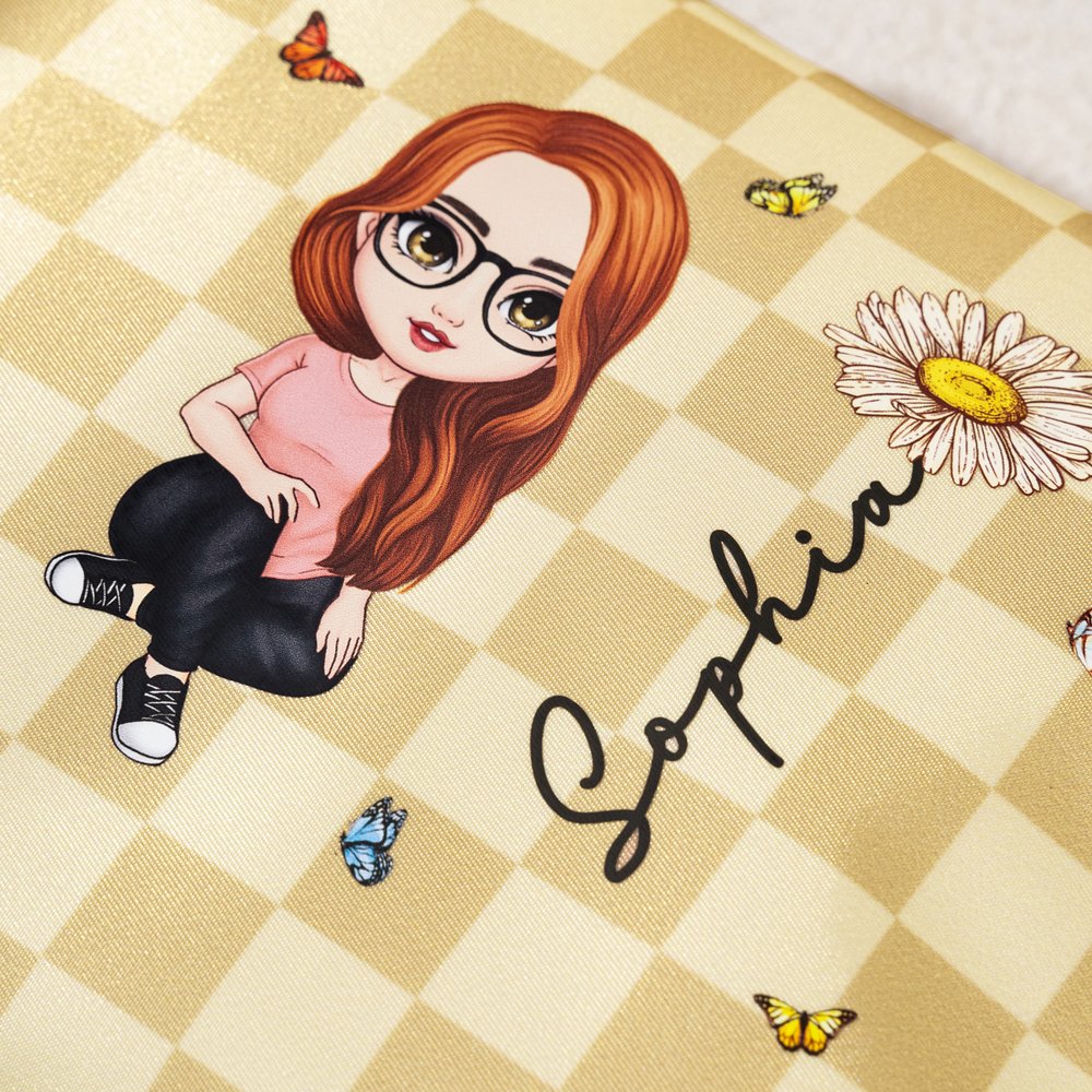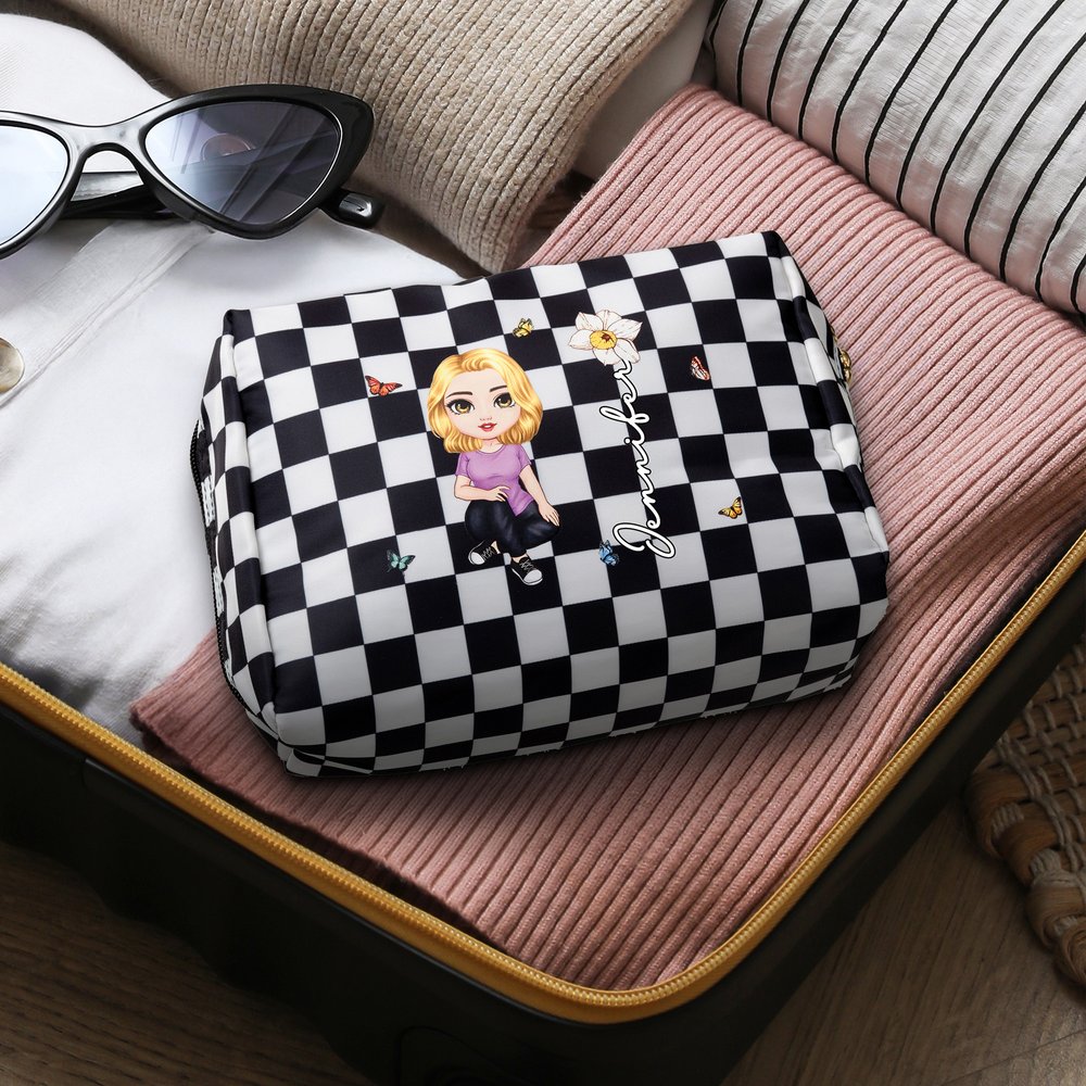 Diese Kosmetiktasche mit einem personalisierbaren Cartoon-Charakter ist lebendig und bezaubernd. Durch die Ergänzung von Geburtsblumen, wie etwa Gänseblümchen, erhält sie eine romantische und zugleich einzigartige Note. Das Schachbrettmuster wirkt klassisch und dennoch stilvoll und verleiht einen Hauch Retro-Charme. Mit Ihrem individuellen Namen wird die Kosmetiktasche mehr als nur ein praktisches Aufbewahrungstool – sie wird zu einem eleganten Statement-Piece, das Ihren persönlichen Stil unterstreicht.