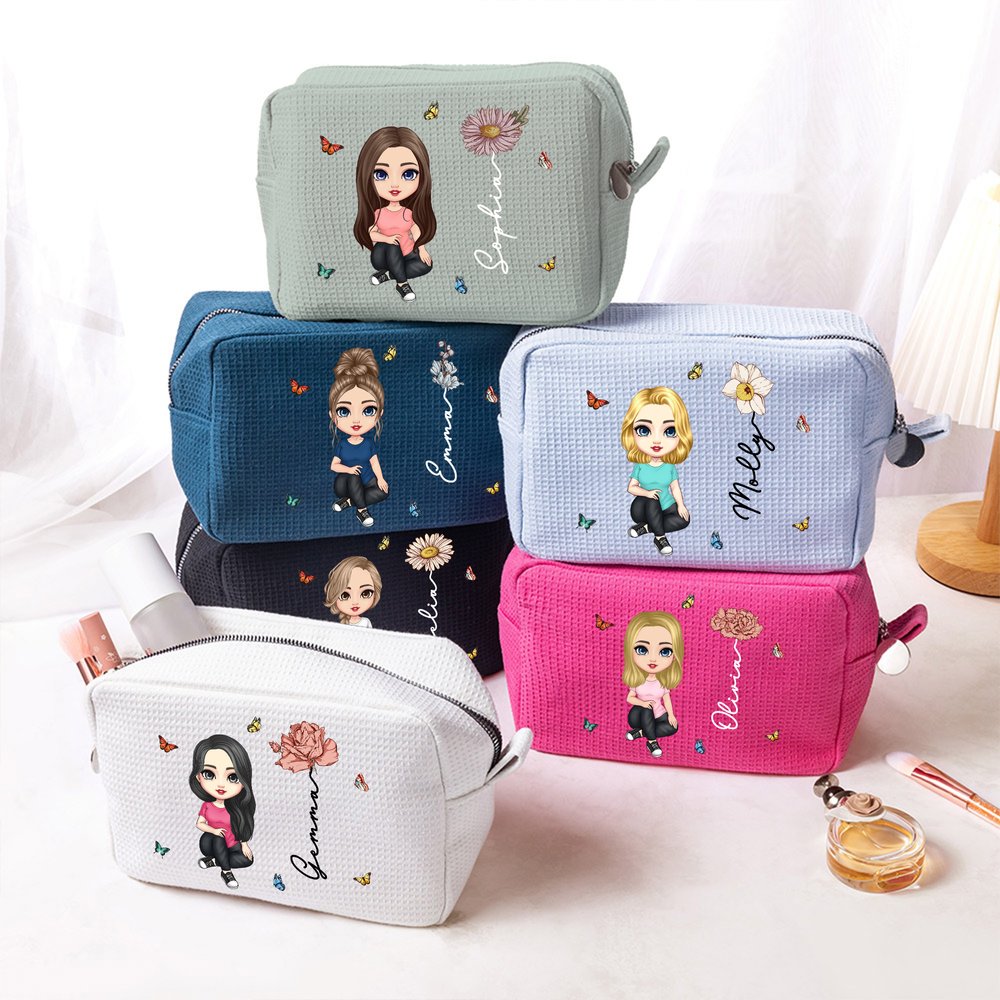 Personalisierte Geburt Blume Cartoon Charakter Multicolor Waffel Makeup Tasche mit Namen und Reißverschluss Reise Essentials Hochzeit Party Geburtstag Geschenk für Frauen