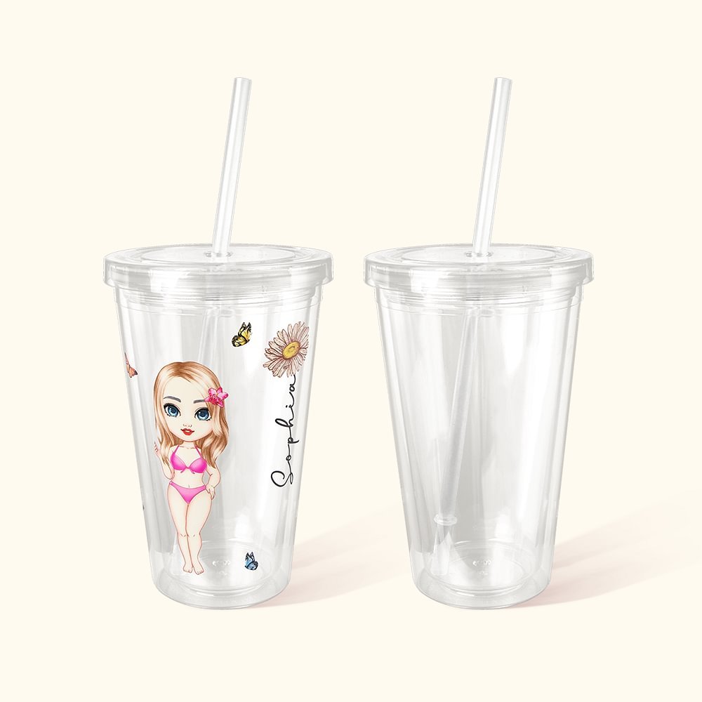 Dieser Becher verfügt über ein personalisiertes Design, das Ihre Geburtsblume und ein charmantes Cartoon-Bild einer Frau im Stil eines Strandurlaubs kombiniert, so dass Sie ein einzigartiges Design erstellen können, das Ihren Stil widerspiegelt. Sie können auch Ihren Namen darauf anbringen, um es unverwechselbar zu machen.