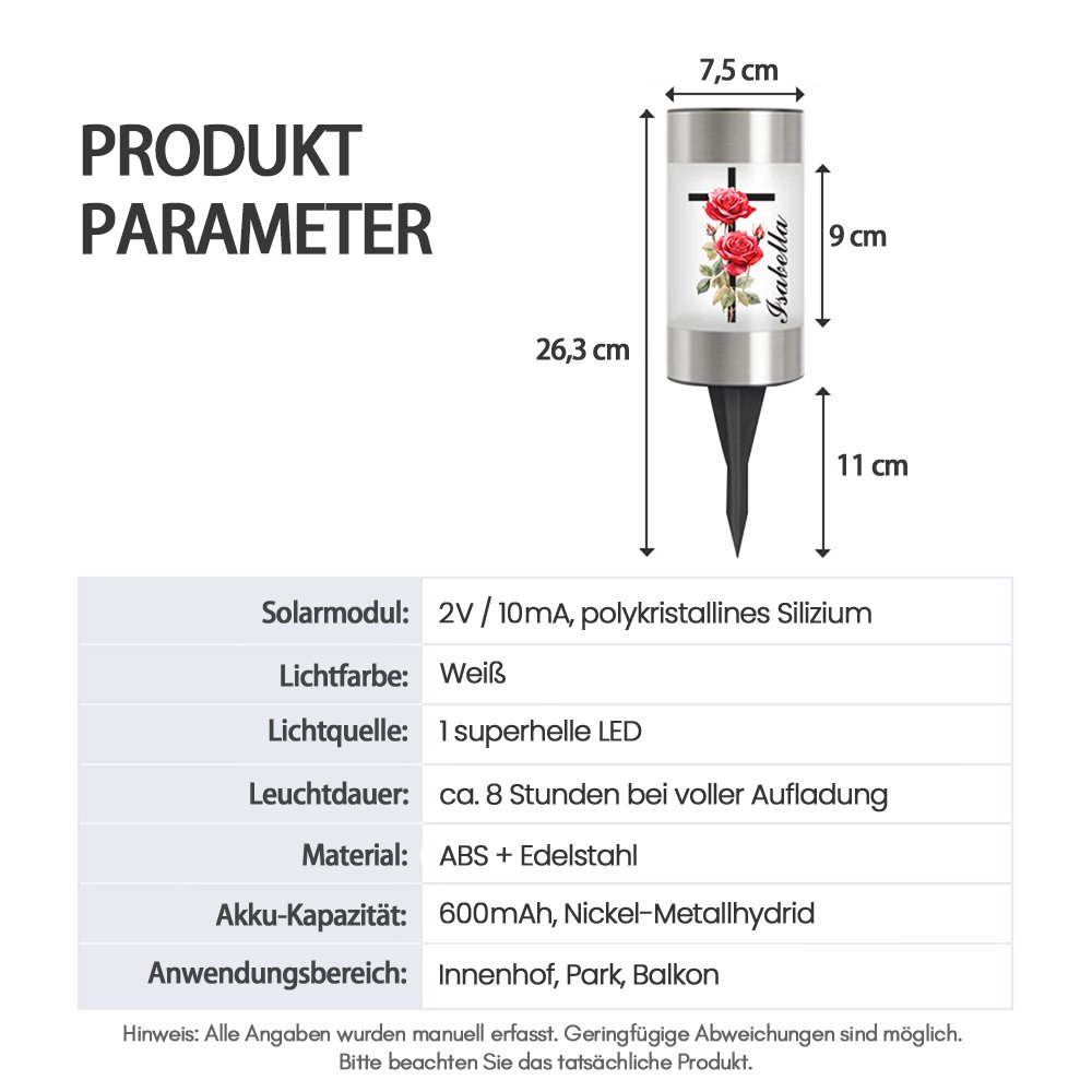 Diese Gartenleuchte vereint auf stilvolle Weise spirituellen Glauben mit dem Alltag. Die filigranen und eleganten Geburtsblumen in Kombination mit dem Kreuz symbolisieren nicht nur tief verwurzelten Glauben, sondern dienen auch als besondere Inspirationsquelle. Darüber hinaus können Sie die Leuchte mit Ihrem Namen personalisieren, um einen individuellen Begleiter des Glaubens zu schaffen, der bei jeder Nutzung zu einem persönlichen Ausdruck wird.