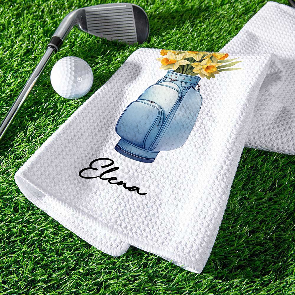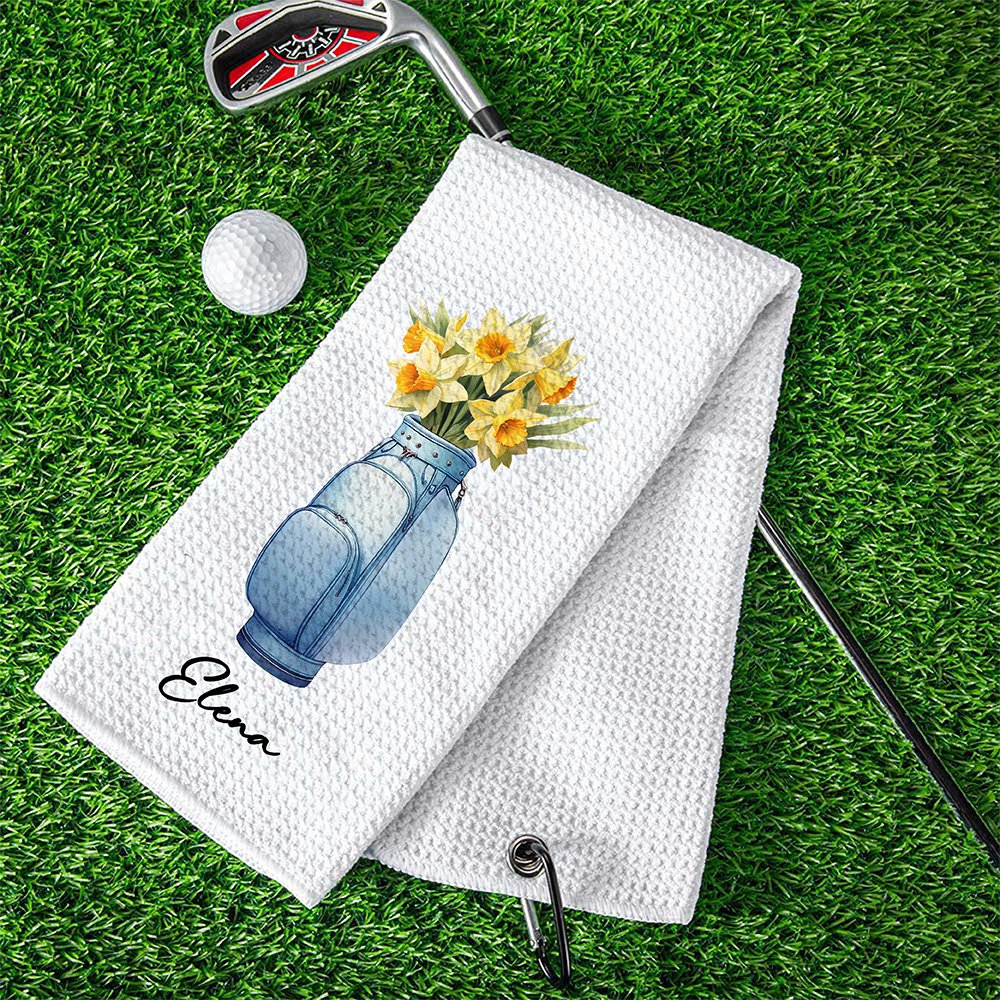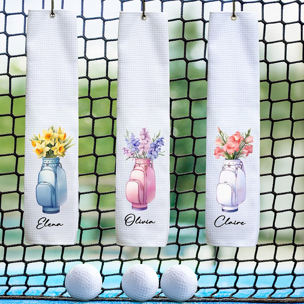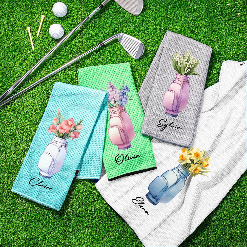Dieses Golfhandtuch ist einzigartig und inspiriert von schönen Geburtstagsblumen, kombiniert mit einem kreativen Golfbag-Vasenmuster, um ein einzigartiges Design zu schaffen, das exklusiv für Sie ist. Sie können Ihren Namen anpassen, um dieses Handtuch nicht nur praktisch, sondern auch personalisiert zu machen.