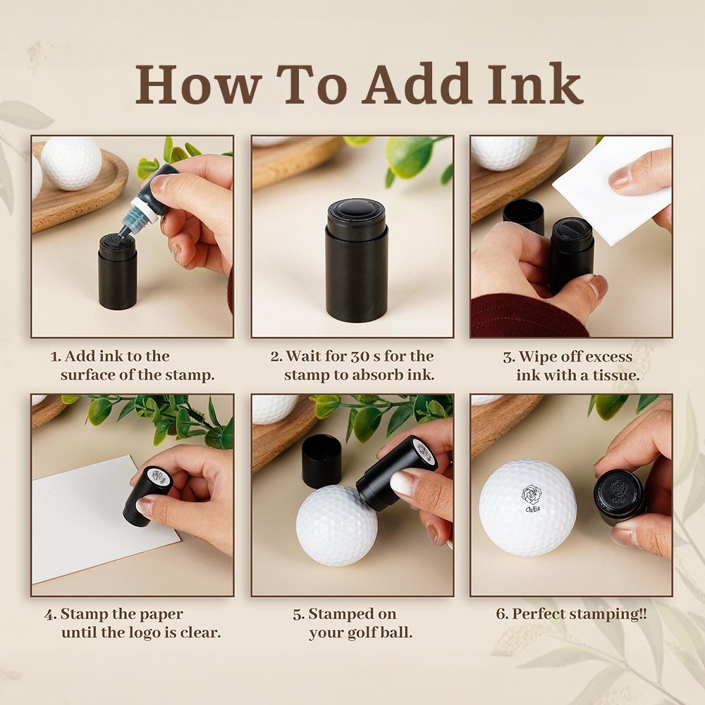 1. Wenn Sie den Stempel zum ersten Mal benutzen, kann sich der Deckel fest anfühlen und schwer abzunehmen sein. Dies ist beabsichtigt, um einen sicheren Sitz zu gewährleisten. Ziehen Sie ihn einfach ab und setzen Sie ihn einige Male wieder auf, damit er sich lockert und leichter zu benutzen ist. 2. Bei der ersten Verwendung verwenden Sie bitte einen Stempel, um den Tintenabdruck auf dem weißen Papier zu testen, um die besten Ergebnisse auf dem Ball zu gewährleisten. Wenn der Abdruck deutlich sichtbar ist, stempeln Sie ihn auf die Oberfläche des Golfballs. 3. Wenn der Abdruck undeutlich ist, oder das nasse Wattestäbchen hin und her auf die Stempeloberfläche auftragen, und dann auf dem Papier in der gleichen Weise wie oben stempeln.